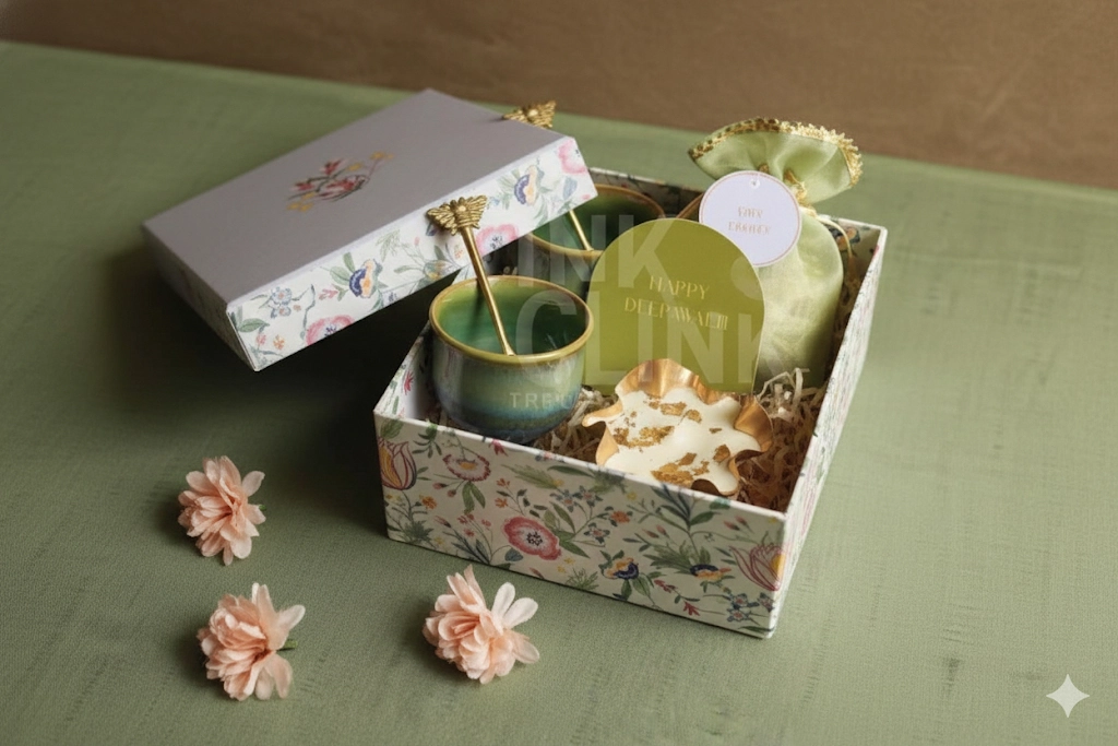 A floral chintz rigid hamper with dry fruits, two ceramic ice-cream cups, brass spoons, scented candle and custom card—presented in a keepsake box, perfect as wedding favors or thank-you gifts.