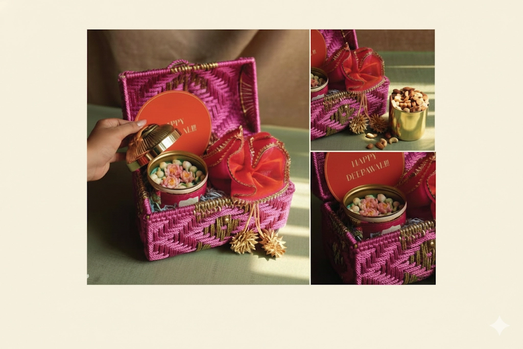 Bright handwoven dome gift box with 150 g dry fruits, lotus mogra candle, organza potli and custom card — a stylish, ready-to-gift hamper for weddings and special moments.