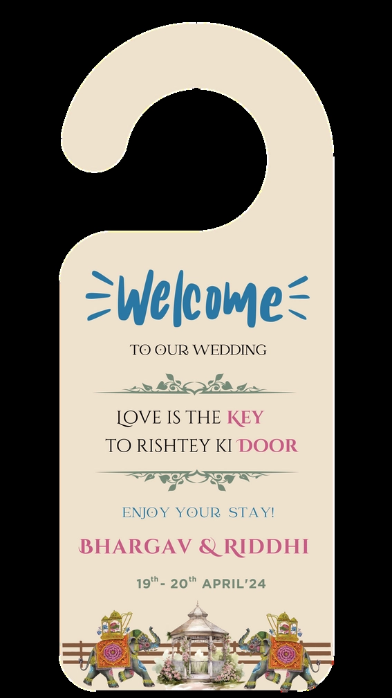 Charming 9" welcome room hanger — pre-cut for hotel doors, durable board print with decorative typography and customizable lines to greet wedding guests in style.