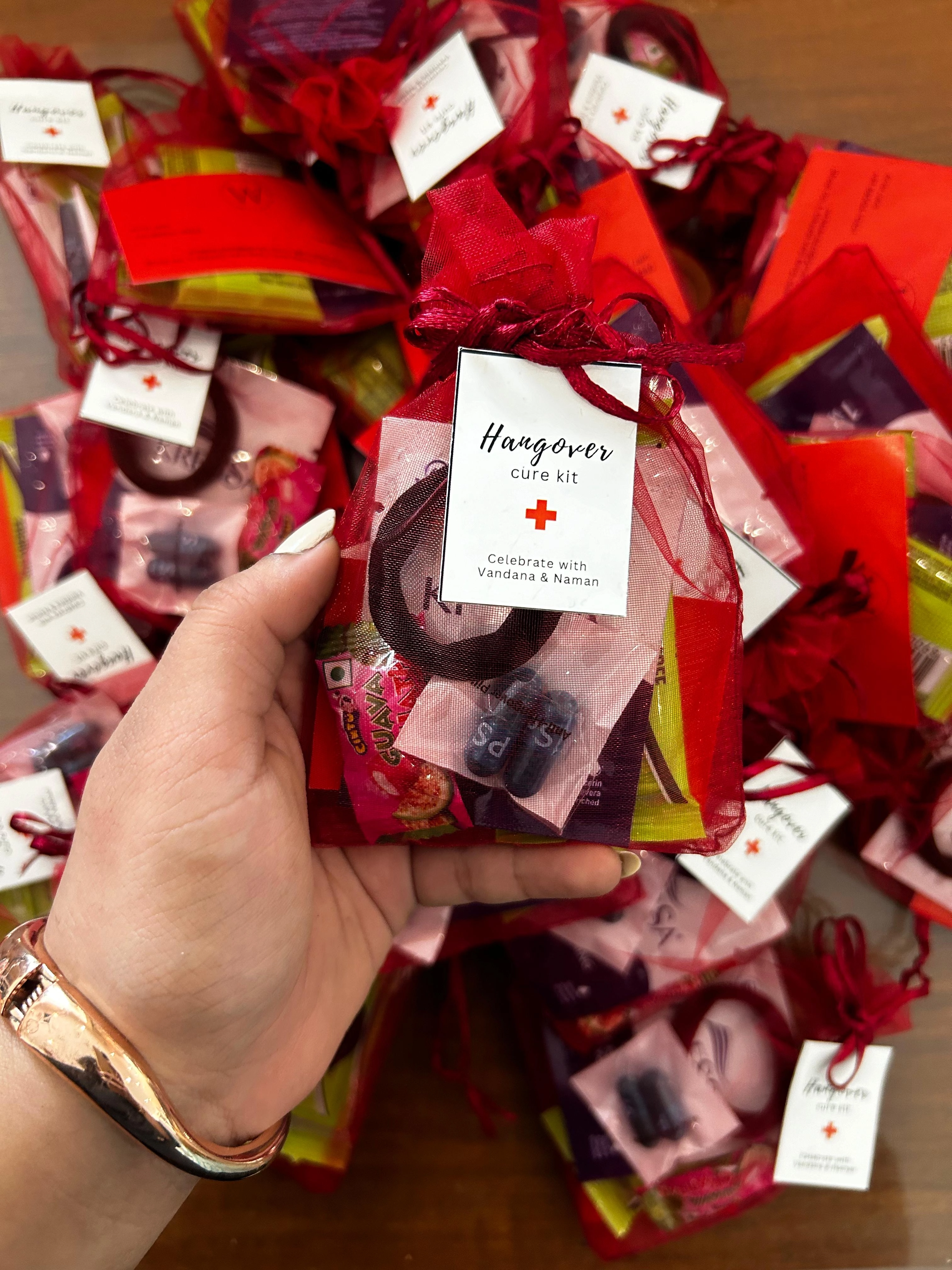 A thoughtful recovery pack designed to rescue guests after late-night celebrations. Each compact kit is elegantly wrapped in sheer organza with a branded tag and includes a sachet of rehydration electrolyte powder, a sugar or candy boost, a cooling eye mask, and an individual pain-relief tablet (packaged) — the exact contents follow the photographed kit and can be customized for event branding or color. Perfect as bachelorette favors, welcome-bag essentials or post-reception pick-me-ups, these kits balance practicality with chic presentation to leave a caring, memorable impression.