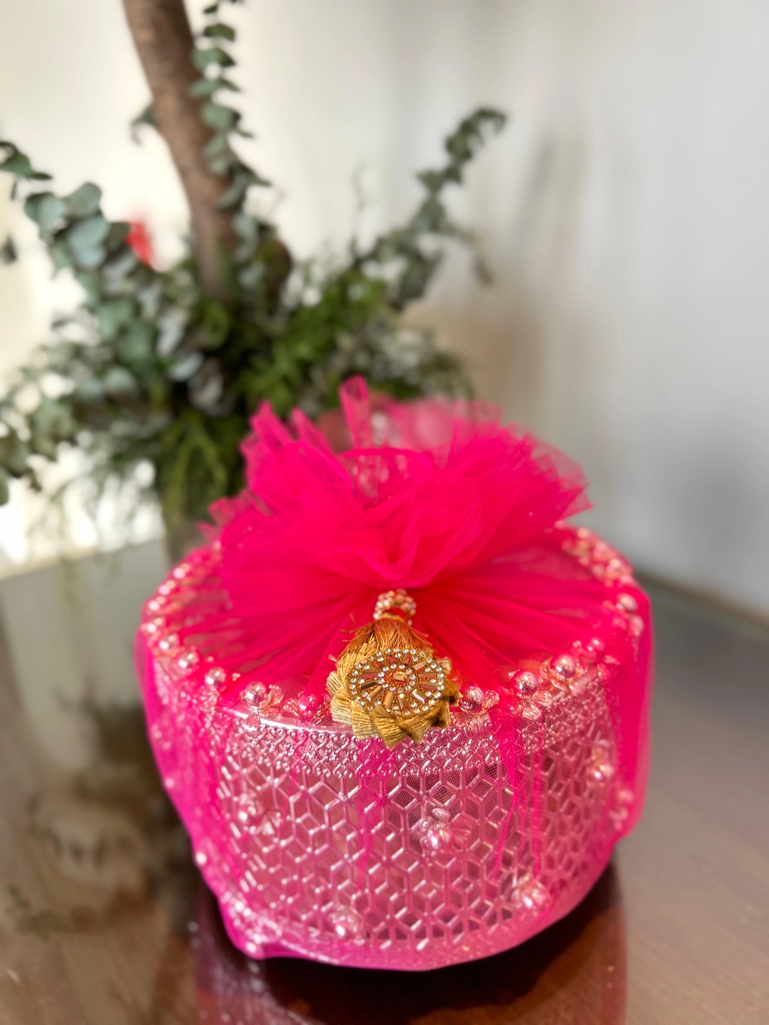 A handcrafted German-silver finish keepsake box finished in vibrant pink, perfect as an elegant return gift or ceremonial accessory. The box features intricately embossed metalwork, a soft pink tulle bow, and a decorative gold-tone clasp visible in the image. Lightweight yet sturdy, it holds sweets, sindoor/kumkum, jewelry or small mementos and arrives gift-ready — ideal for wedding rituals, mehndi or haldi ceremonies and as a memorable guest token.