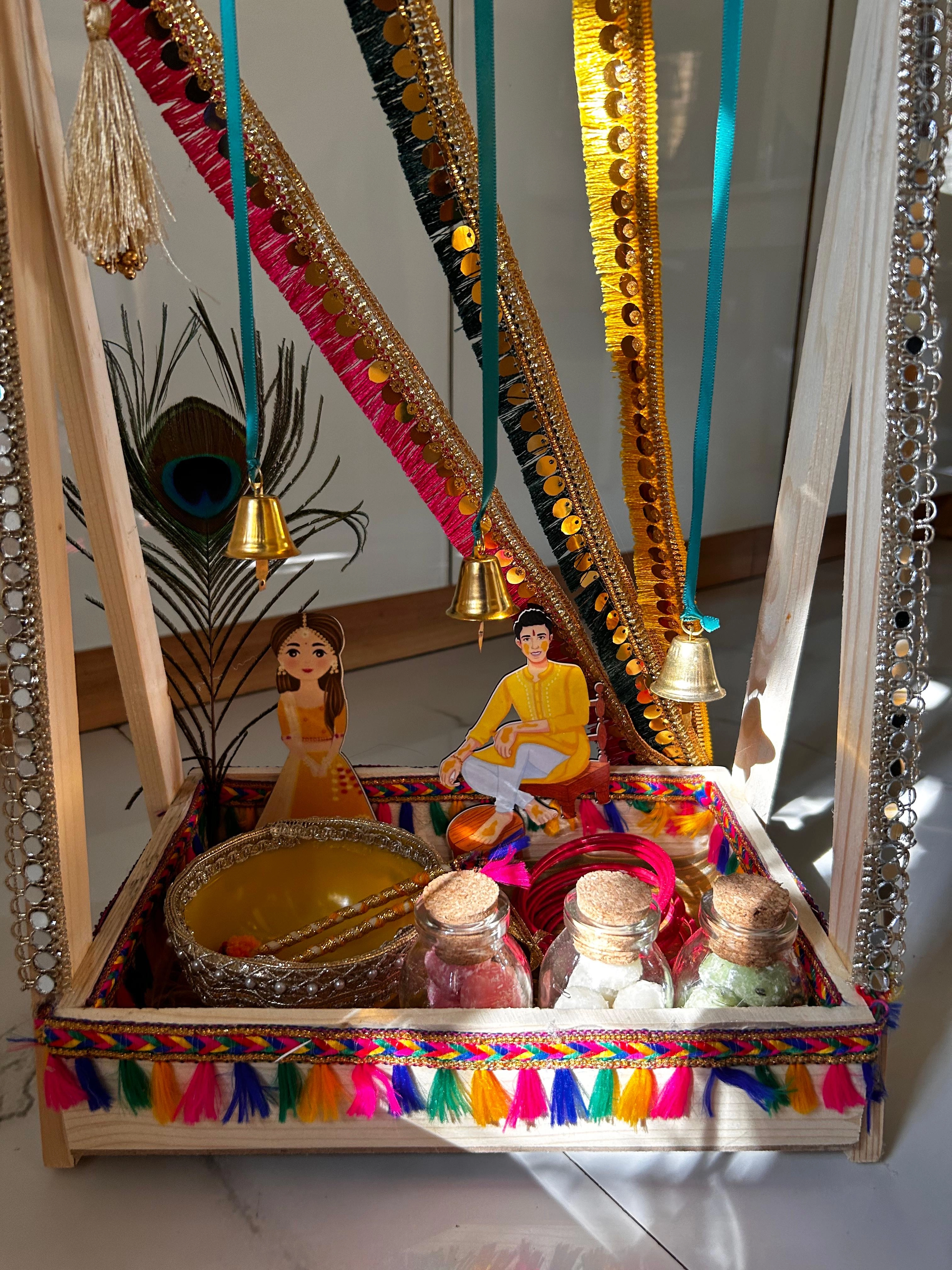 A handcrafted Haldi platter designed to brighten your pre-wedding rituals, this kit pairs colourful textile trims, mirror and sequin accents, and brass bells with essential haldi ceremony items. The set includes a decorated wooden tray, two glass spice jars, a haldi bowl, turmeric (decorative), and festive paper figurines — all visible in the image — finished with multicolour tassels for a joyful presentation. Ideal for intimate Haldi ceremonies, it’s ready-to-gift and can be used as a keepsake for ritual photos and décor.