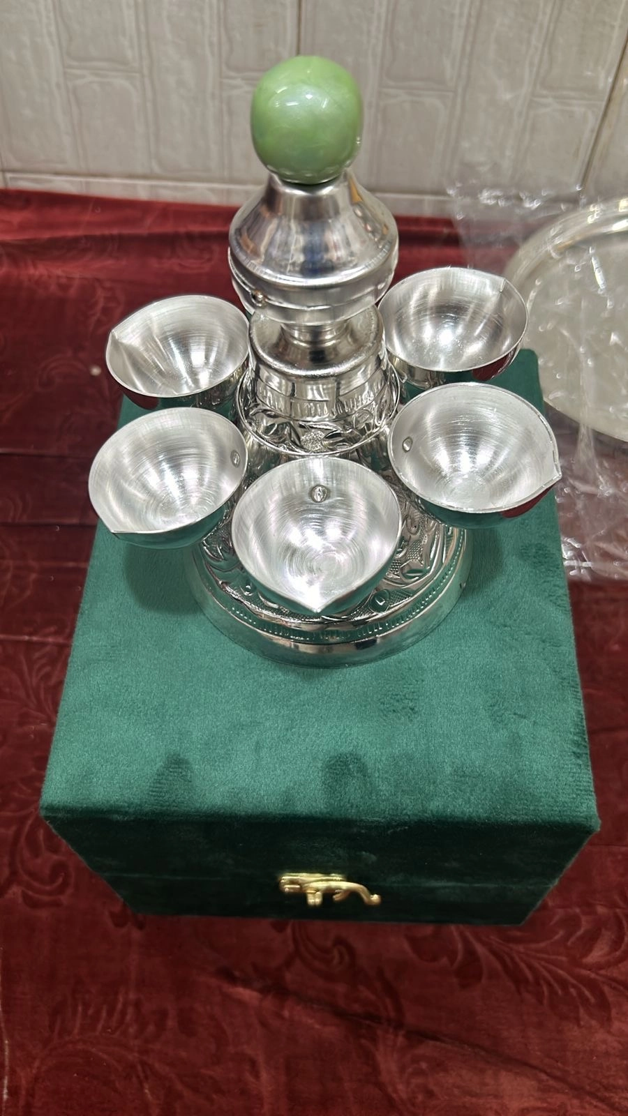 Handcrafted in polished German silver finish, the Samar Samai is a ceremonial diya stand designed for traditional pooja and wedding rituals. The tiered centre hold with five removable shallow bowls sits on an engraved base — perfect for oil wicks or ghee lamps — and the bright silver finish gives an auspicious, heirloom look. Ideal as a puja centerpiece or a thoughtful return gift, each piece blends durable metalwork with intricate engraving and arrives ready-to-use for festive ceremonies and altar décor.