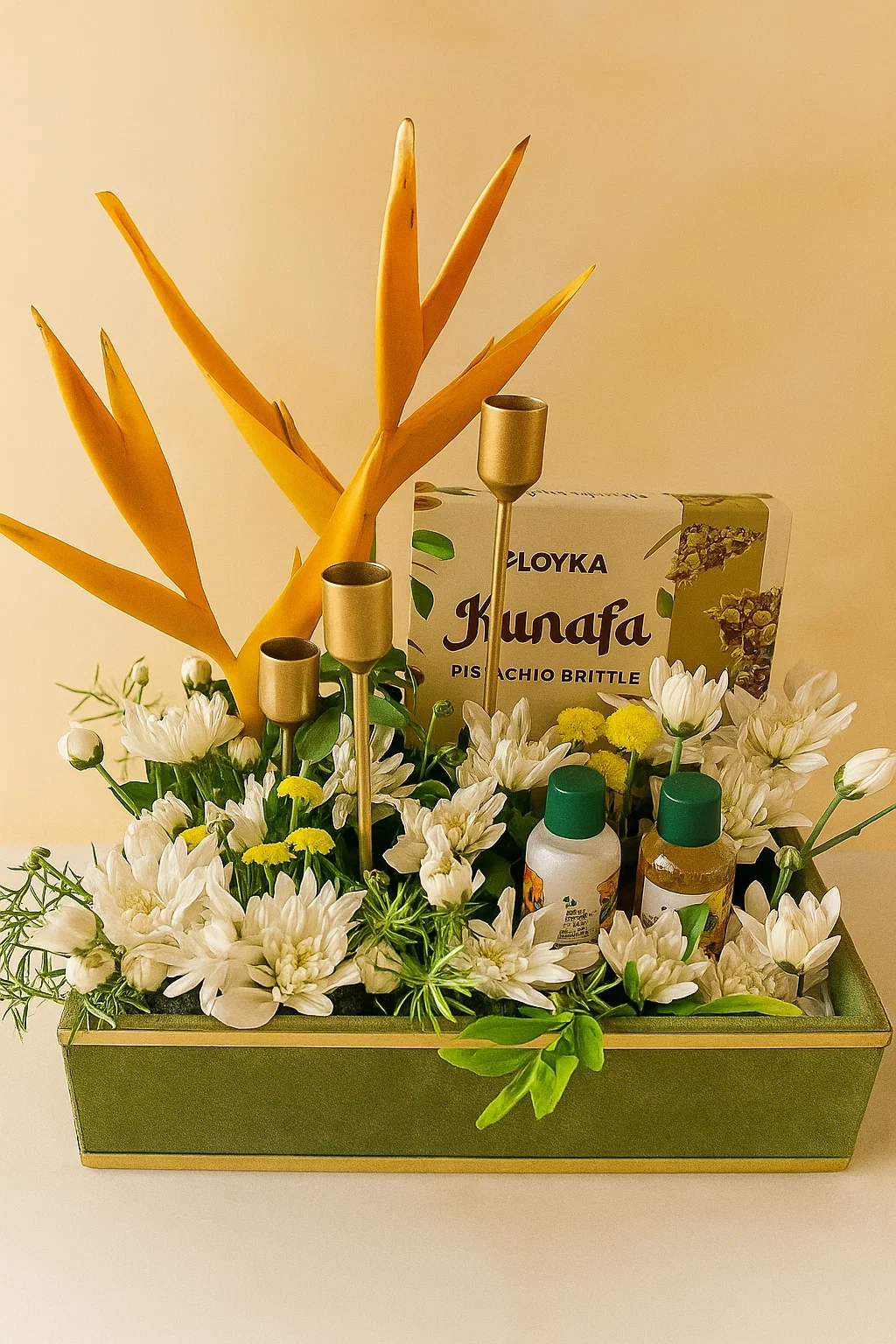 A stylish floral hamper that pairs fresh-feel faux blooms with gourmet treats to create a memorable wedding gift or decor accent. The green suede-look rectangular basket is filled with white and yellow silk flowers, three brass candleholders, two premium mini-syrup or lotion bottles, and a box of Loyka Kunafa pistachio brittle — beautifully arranged and finished with a green ribbon. Ideal as a welcome table accent, bridesmaid gift, or reception centerpiece, this keepsake hamper blends craftsmanship and edible luxury for an elegant presentation.