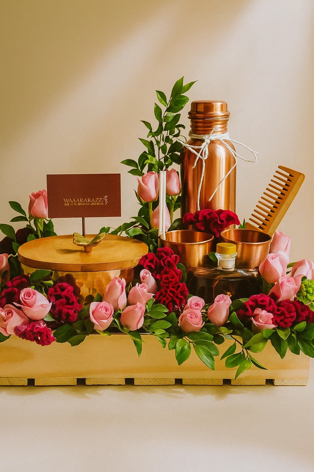 Give a sip of tradition wrapped in floral elegance — a polished copper bottle set with cups, wooden-lid jar, comb and scented vial, arranged in a handcrafted floral tray. Perfect for wedding gifting and memorable keepsakes.