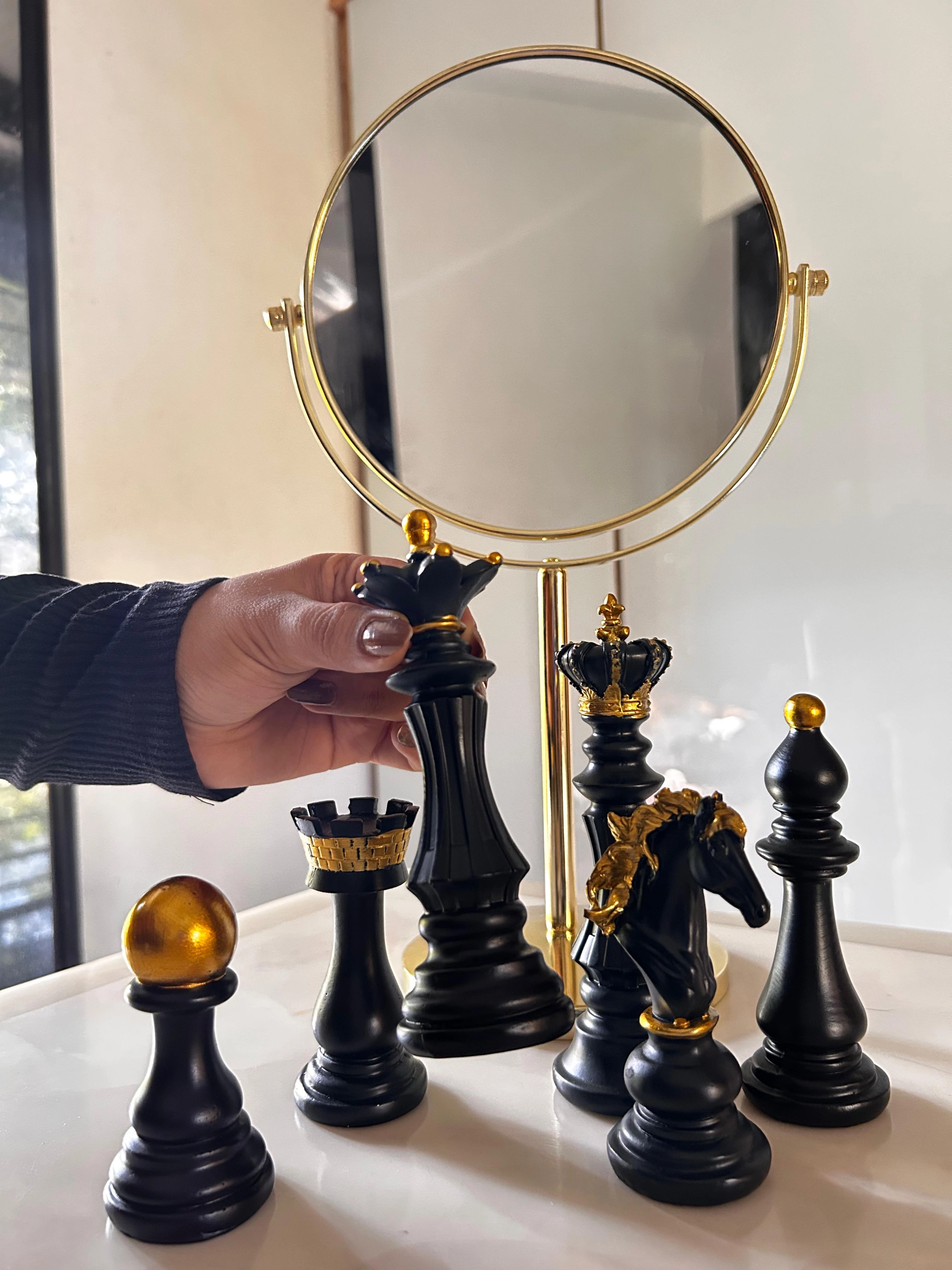 An elegant black-and-gold chess keepsake designed as a stylish wedding or anniversary gift and memorable table décor. Each solid-feel piece is finished in matte black with hand-applied gold accents on crowns and trim, creating a luxe contrast visible in the image. Perfect as a decorative set, mantel display, or a compact travel board companion, this keepshake blends artisanal detailing with durable materials. Gift-ready for couples who love strategy and style, it arrives ready to display and treasure for years.