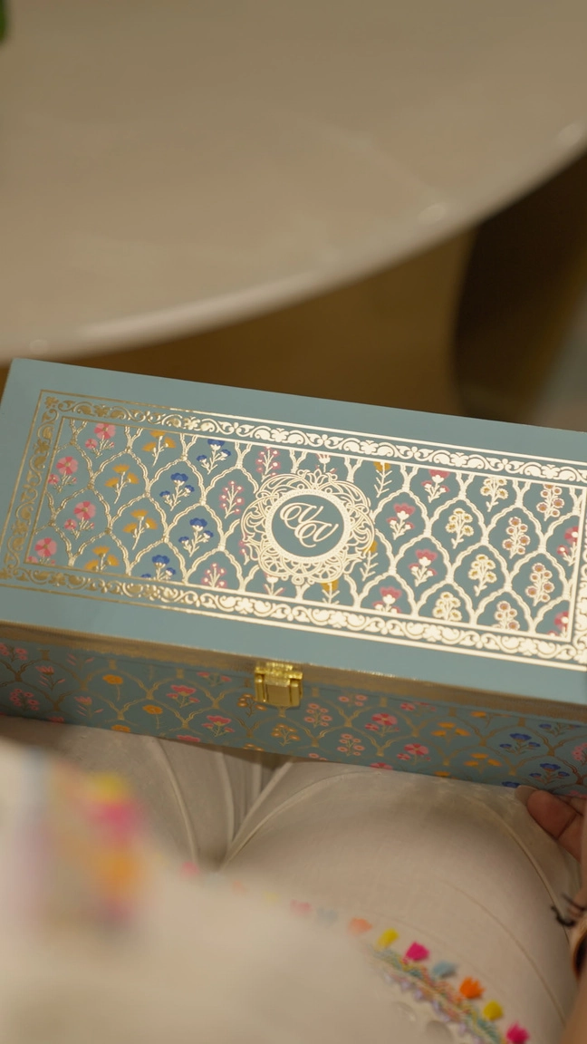 A refined dry fruit gift set presented in a hand-finished keepsake box with gold-foil detailing and a secure latch. The set includes three glass jars with screw-top lids and customized wrap labels (example: bride & groom initials), each filled with your choice of premium dry fruits — ideal for wedding return gifts or festive hampers. The box’s intricate pattern and metallic accents make it gift-ready without extra wrapping; it’s designed to be both beautiful and reusable as home storage or a memento.