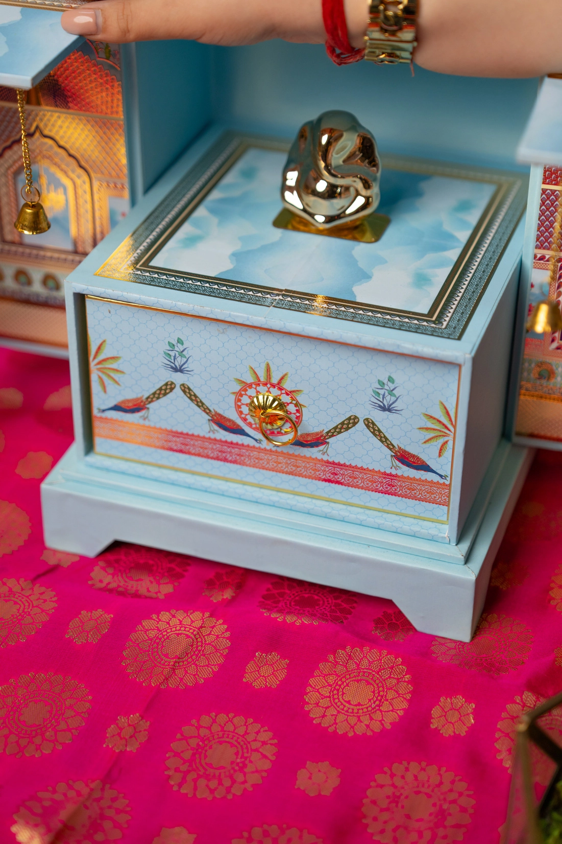 An ornate, keepsake invitation box inspired by traditional Indian palatial motifs, this luxury kit opens like a mini temple to reveal two scented glass jars with custom seals, gold-accented scroll invitations, and a decorative Ganesh topper. Finished in pastel lacquer with hand-illustrated panels, metallic gilt edges and a pull-out drawer lined in satin, each piece is crafted to feel like a ceremonial gift. Fully customizable with guest names, monograms and colour options, this invitation transforms your wedding invite into a treasured memento your guests will keep.