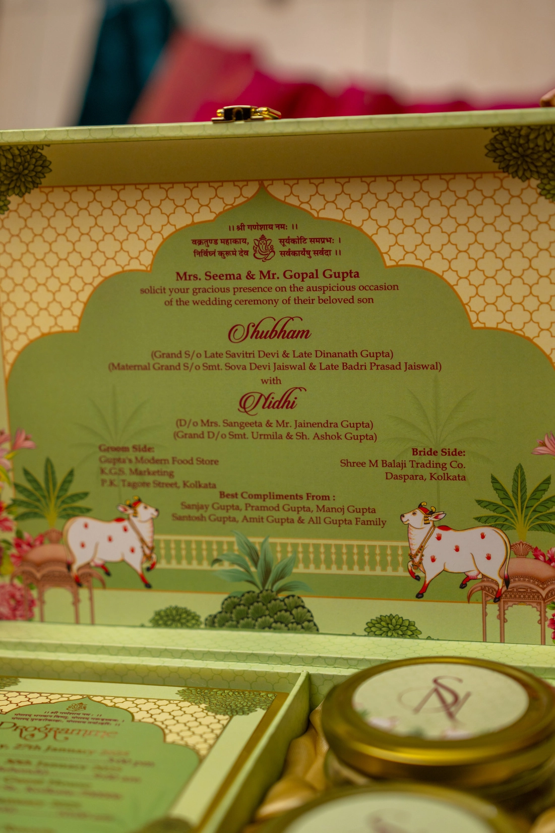 An exquisite boxed wedding invitation inspired by traditional motifs and modern luxury. The mint-green lacquered MDF box features hand-illustrated cows, foliage and a monogrammed crest on the lid; inside is a satin-lined tray holding a full-sized, die-cut invitation card plus two gold-lidded glass jars with custom monogram stickers. Each set includes ribbon pulls, printed RSVP/enclosure card and secure magnetic clasp — a keepsake presentation designed to wow guests and double as a decorative memento.