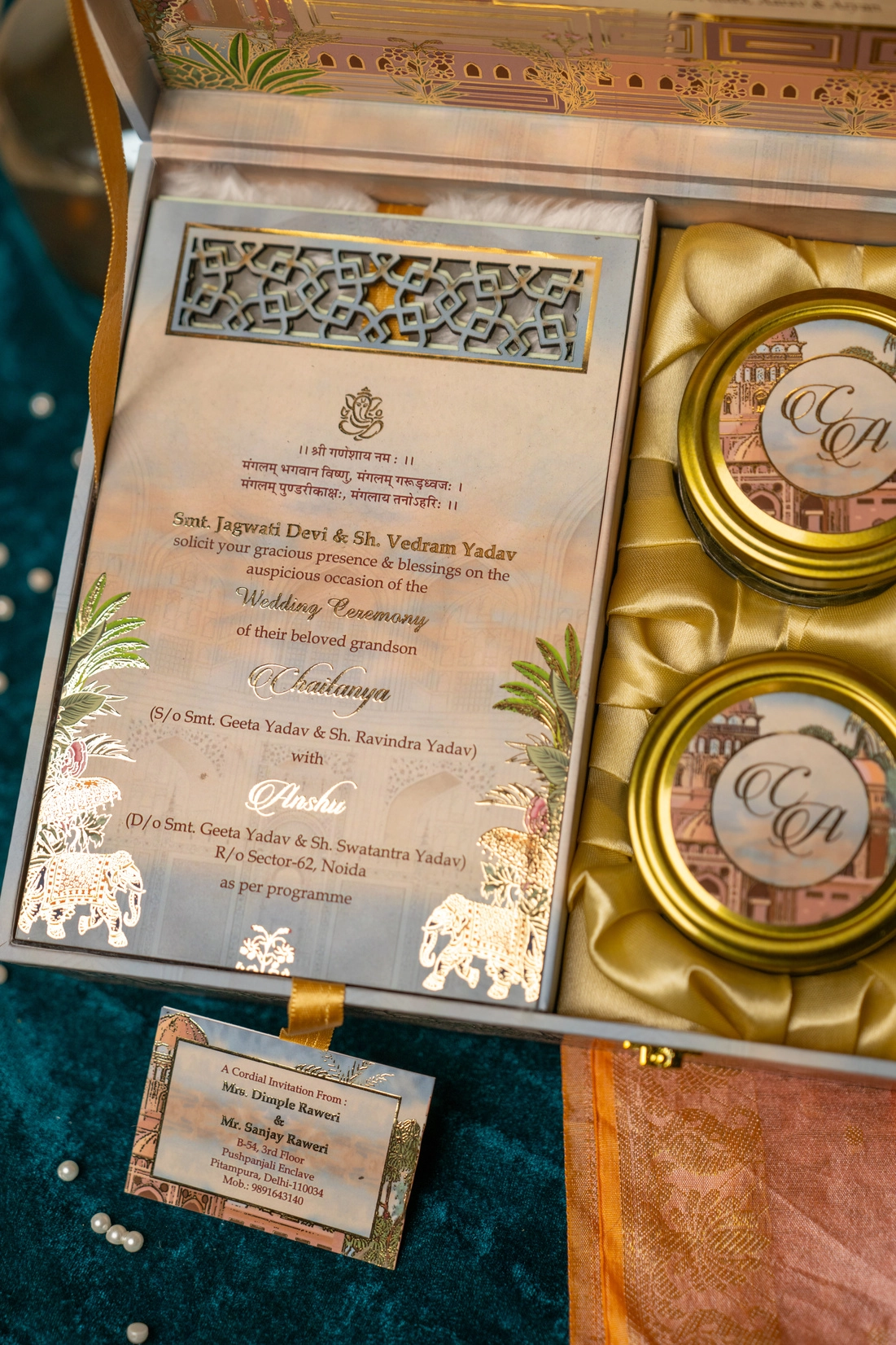 A keepsake-worthy boxed invitation that blends traditional Indian art with modern luxury. The handcrafted box features intricate palace and elephant artwork, gold-foil accents and a magnetic closure; inside you'll find a printed invitation card, elegant laser-cut panel, and four glass jars nestled in satin-finish compartments — each jar sealed with a custom sticker and gold rim. Finished with ribbon pull and personalised nameplate, this set is designed for couples who want an opulent, memorable first impression and a reusable gift for guests.
