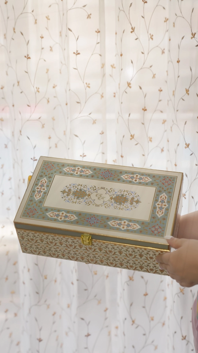A handcrafted invitation box that doubles as a keepsake — this luxury wedding card arrives housed in a richly patterned rigid box with gold trim and satin-lined interior. Each kit includes a printed invitation card set, two glass jars with custom labels, gilded latch, and organza ribbon ties, all presented on plush gold satin to create an opulent unboxing moment. The exterior features traditional floral motifs and metallic accents; personalization options include custom card wording and jar sticker designs. Perfect for couples who want an heirloom-quality invite that feels like a gift.