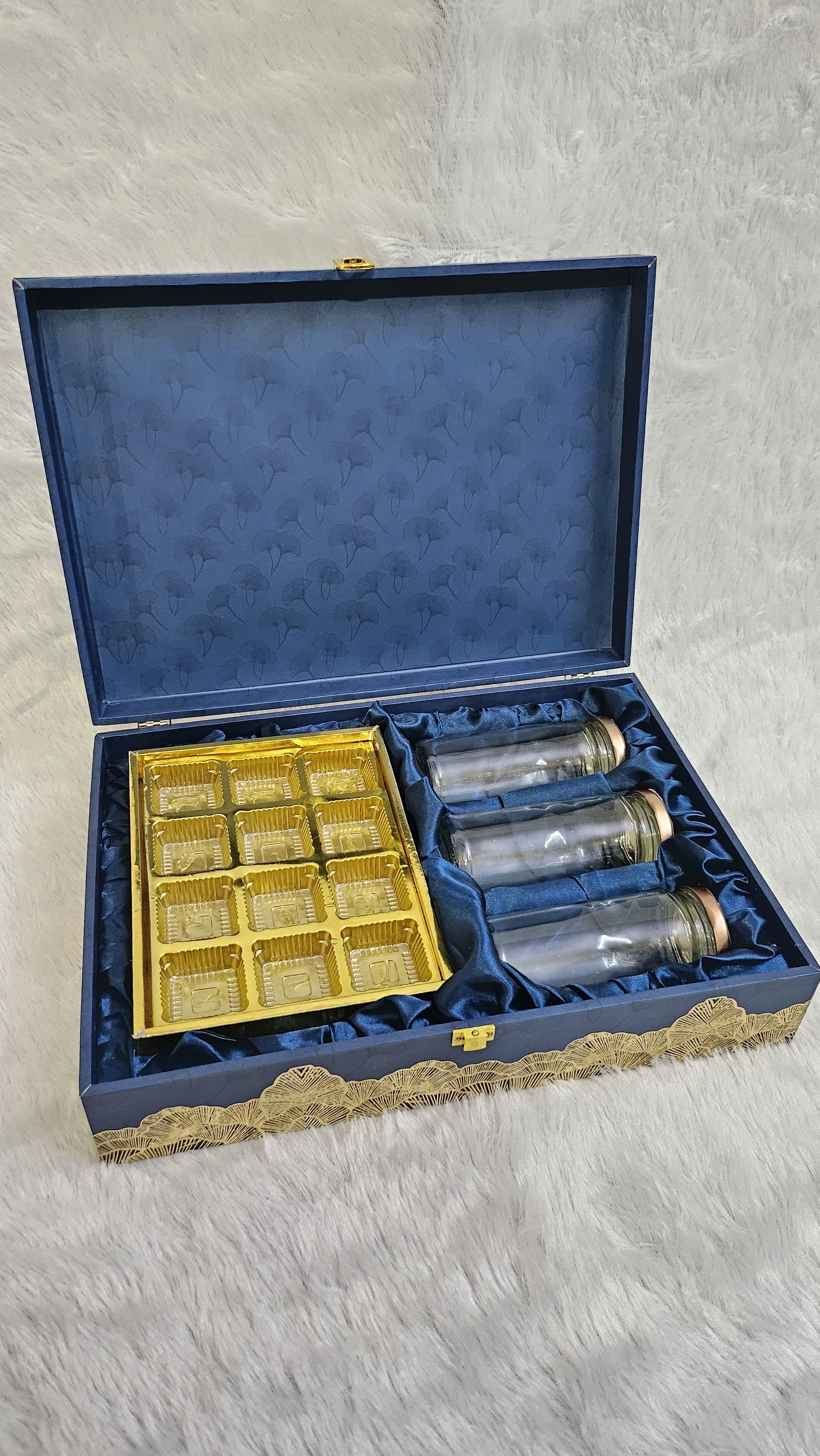 Elevate your wedding return gifts with this stunning navy blue gift box, featuring intricate golden embossed patterns for a luxurious touch. Inside, discover two premium glass jars with gold lids, perfect for filling with sweets, chocolates, or personalized favors, alongside a matching gold tray for elegant presentation. Crafted from high-quality materials with soft satin lining, this box creates a memorable keepsake that guests will cherish. Fully customizable with your names, dates, or logos to make your special day unforgettable.
