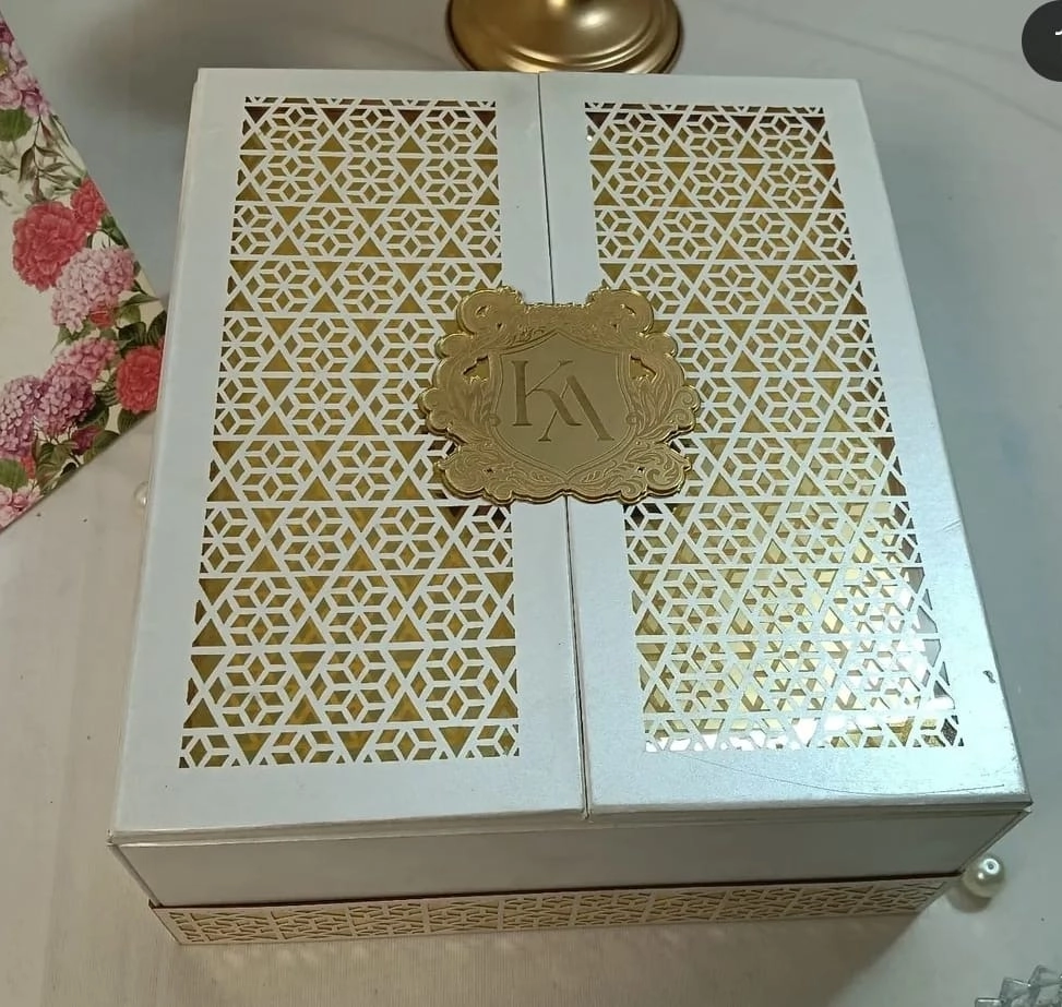 This premium wedding invitation box is a handcrafted keepsake designed to set an elegant tone for your celebration. The hinged box features intricate laser-cut geometric panels over a gold-foil interior and a bespoke gold monogram seal on the lid, creating a luxe reveal when opened. Each set is finished with pearl accents and a velvet-lined compartment to hold printed invites, RSVP card and small ceremonial tokens. Customization options include monogram initials, foil colour and interior lining — perfect for couples who want a refined, memorable first impression.