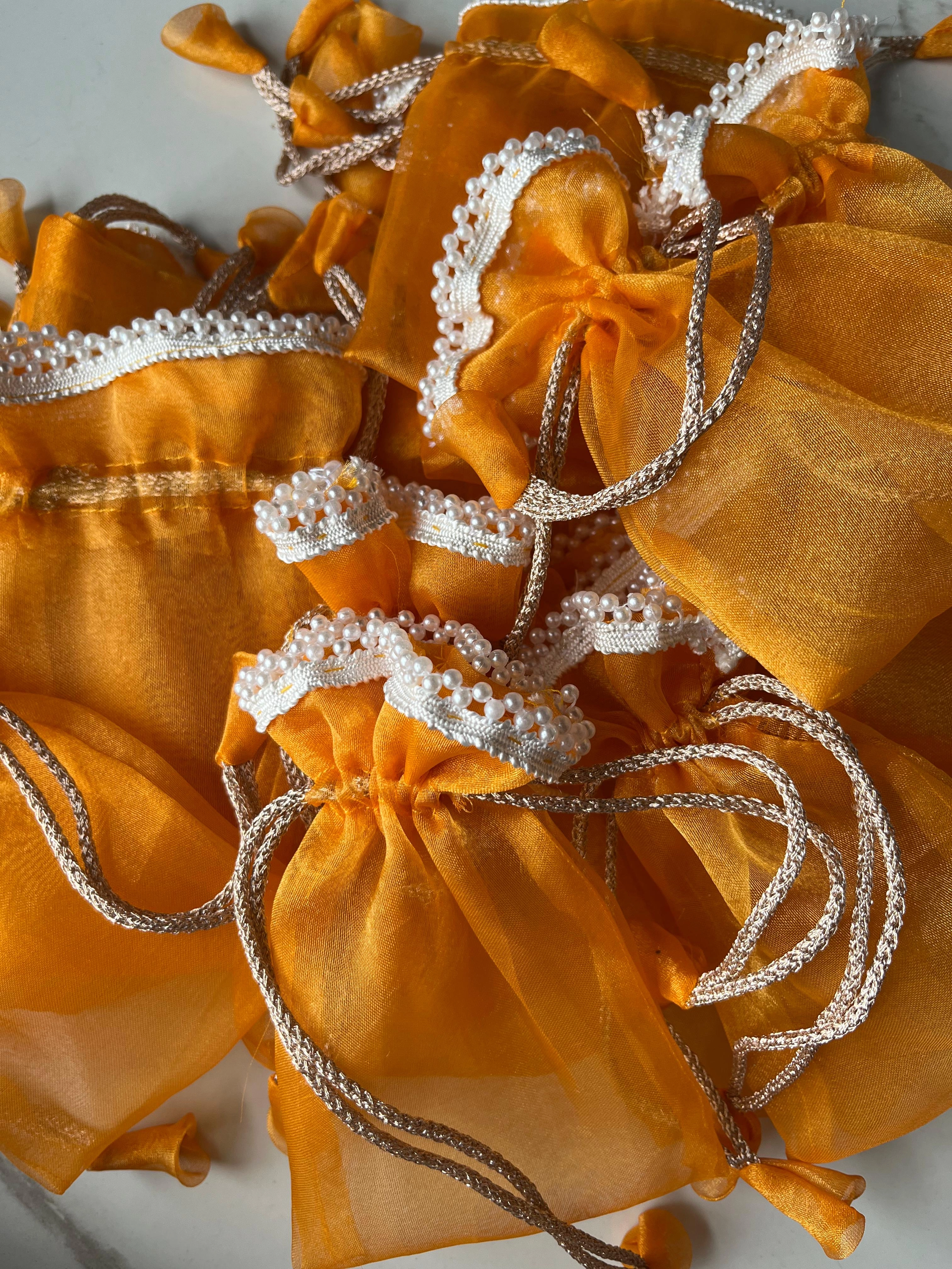 Elevate your bridal ensemble with this exquisite Orange Pearl Potli Bag, handcrafted from luxurious orange organza fabric that shimmers with every movement. Delicately adorned with clusters of lustrous pearls, intricate white lace trims, and elegant gold drawstrings, it exudes timeless sophistication and festive charm. Perfect for wedding receptions, sangeet nights, or mehendi ceremonies, this potli serves as both a stylish accessory and cherished keepsake. Its spacious design accommodates essentials like jewelry, makeup, or small gifts, blending tradition with modern elegance for your special day.