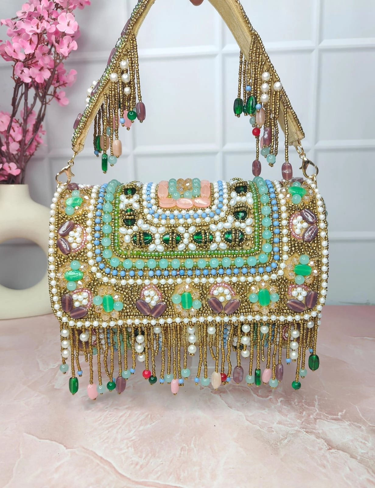 Elevate your bridal elegance with this designer heavy bridal flap clutch, a masterpiece of intricate embroidery and beadwork in vibrant emerald greens, golds, and multicolored gems. Featuring a structured flap design with luxurious tassel accents and dangling beaded fringes for dramatic flair, it's handcrafted for the modern bride seeking opulence. The rich detailing includes shimmering sequins, pearls, and semi-precious stones, ensuring it complements any wedding gown. Perfect as a cherished heirloom, this clutch combines timeless craftsmanship with customizable touches to make your special day unforgettable.