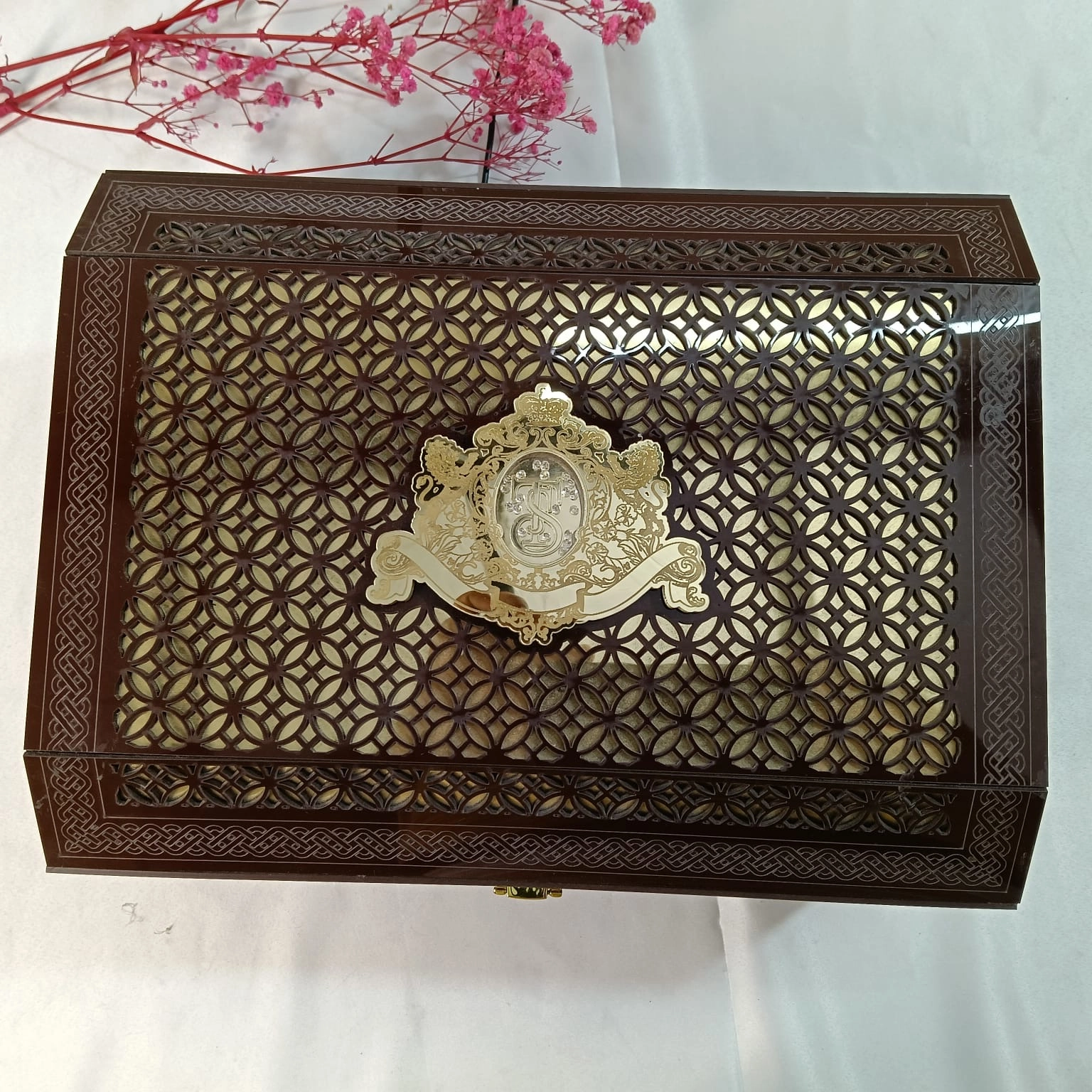 Elevate your wedding announcements with this premium luxurious invitation box, crafted from rich brown wood with intricate lattice jaali work and gleaming gold foil embellishments. The standout centerpiece is a majestic gold-embossed crest featuring elegant motifs, secured by a delicate brass latch for a touch of timeless royalty. Perfect for housing custom invitations, RSVP cards, or keepsake inserts, this heirloom-quality box exudes sophistication and cultural elegance. Fully customizable in design, monogram, and finishes, it transforms a simple invite into a cherished memento your guests will treasure forever, setting the tone for your grand celebration.