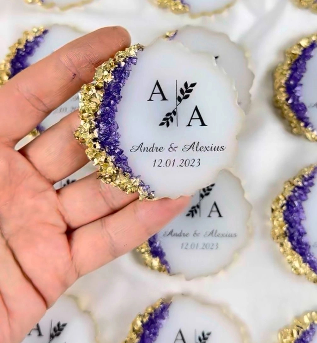 Elevate your bridal ensemble with our exquisite 3-inch brooch pin, meticulously handcrafted for the modern bride seeking timeless elegance. Featuring a luxurious geode-inspired design with shimmering purple crystal edges and intricate gold detailing, this pin showcases a personalized monogram plaque—perfect for displaying your initials or wedding motif. Ideal for securing veils, sashes, or adorning bouquets, it adds a touch of opulent sparkle to your ceremony attire. Fully customizable in color and engraving, it's a cherished heirloom that captures your love story with unmatched sophistication and durability.