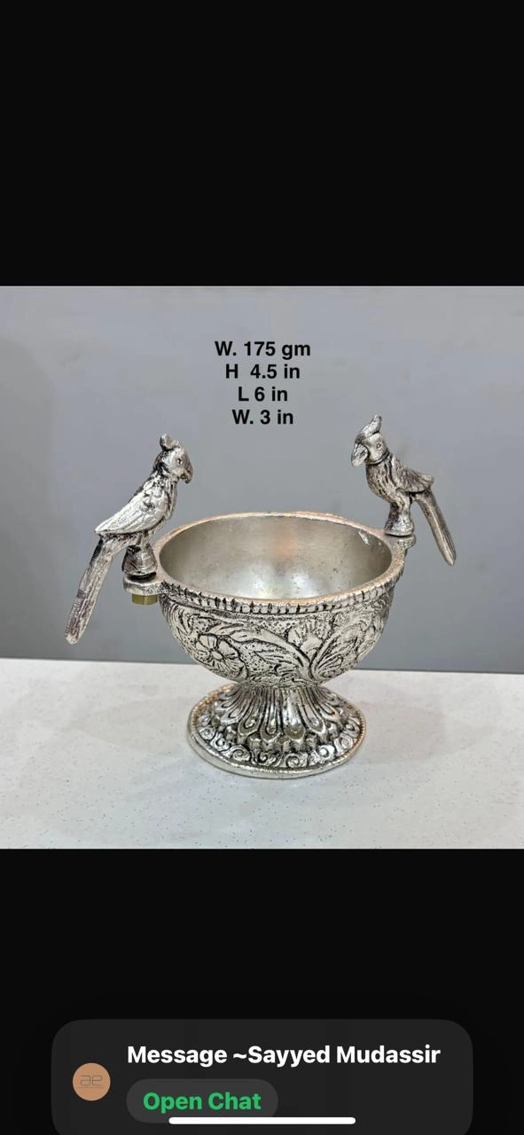 Elevate your wedding festivities with this exquisite fancy bowl set, handcrafted from premium silver with intricate floral engravings and charming cardinal bird figurines perched on the rims. Measuring L 6 in, W 4.5 in, H 4.5 in (bowl) and birds W 3 in, these versatile pieces are perfect for serving sweets, nuts, or as stunning table centerpieces. The detailed craftsmanship and luxurious finish make them cherished return gifts or heirloom keepsakes. Ideal for gifting to guests, adding a touch of traditional elegance and cultural charm to your special day.