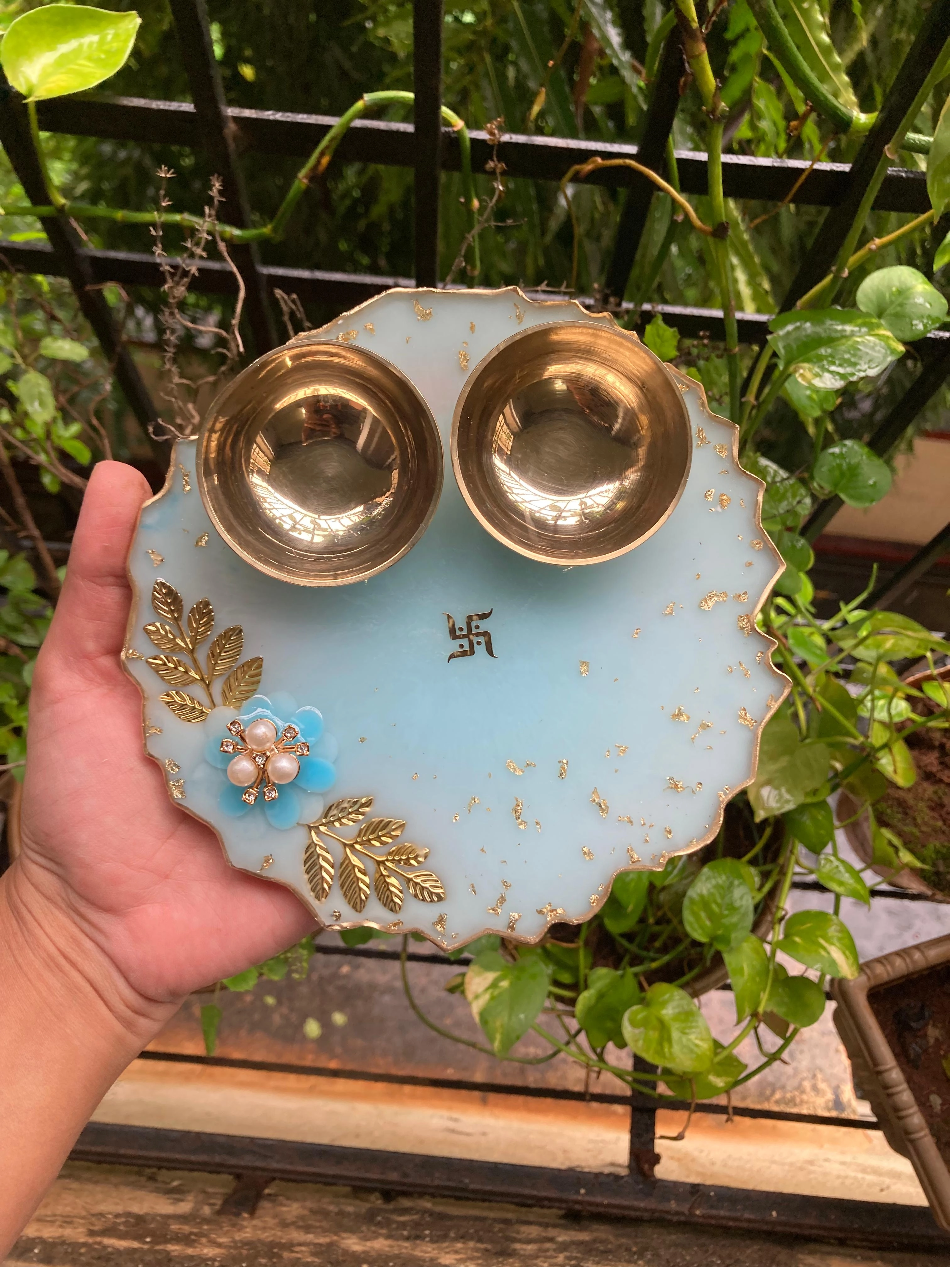 Elevate your wedding ceremonies and sacred rituals with this handcrafted 6-inch Resin Pooja Thali, featuring a stunning blue resin base shimmering with gold accents and intricate leaf motifs. It includes two gleaming brass katoris for offerings, a central Om symbol, pearl embellishments, and decorative elements for an authentic touch. Perfect for aarti, haldi ceremonies, or pooja during your special day, this durable, artisanal piece blends tradition with modern elegance. Customize colors and designs to match your wedding theme, creating a cherished keepsake that symbolizes blessings and prosperity for the couple.