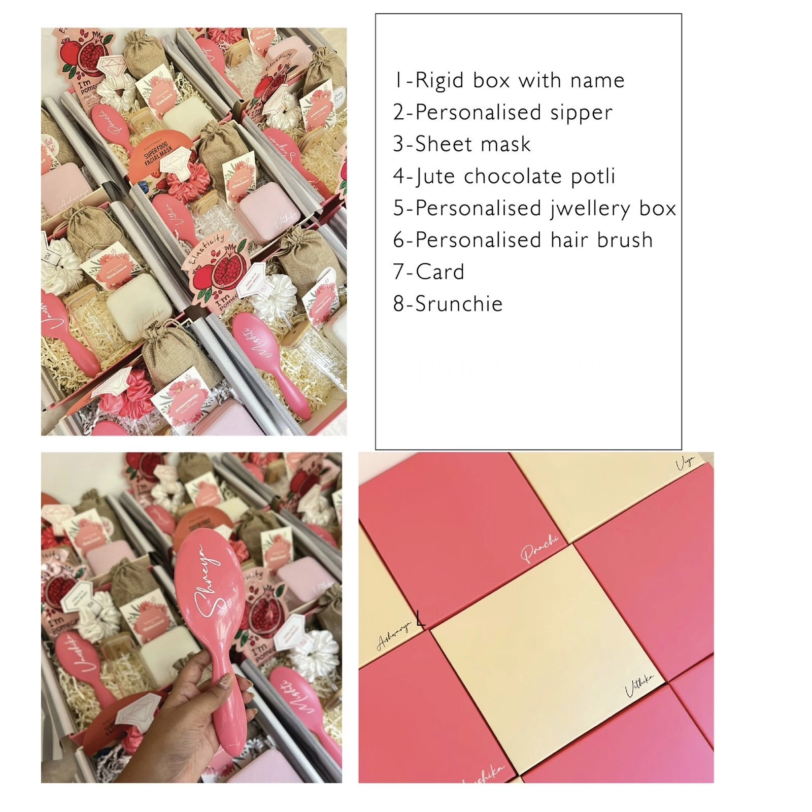 Spoil your bride tribe with this thoughtfully curated bridesmaid hamper in dreamy peach and blush tones. Each rigid box comes personalised with your bridesmaid’s name and is packed with keepsakes and self‑care treats: a personalised sipper, luxe sheet mask, jute chocolate potli, personalised jewellery box, personalised hairbrush, soft scrunchie and a themed bridesmaid card. Beautifully arranged on shredded filler with coordinated tags, this hamper feels both indulgent and heartfelt. Ideal as a bridesmaid proposal or thank‑you gift, it adds a touch of celebration from the moment they lift the lid and becomes a keepsake they’ll cherish long after the wedding celebrations end.