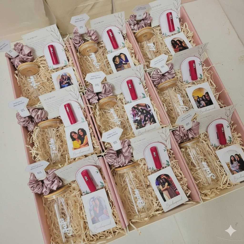 Ask your favourite girls in the most memorable way with this personalised bridesmaid hamper, featuring a custom sipper, scented candle, lip balm, satin scrunchie, polaroid photo and a heartfelt card in a luxe keepsake box—designed to celebrate your bond and your big day.