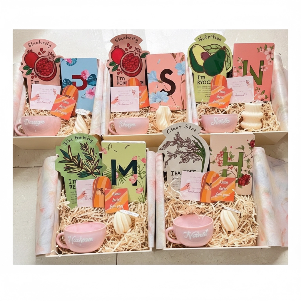 Celebrate your bride tribe with this beautifully curated Bridesmaid Hamper, thoughtfully styled for picture-perfect proposals and thank-you gifts. Each box features a personalised initial-themed notebook or card, a pink ceramic or glass mug, indulgent bath or body treats, and premium goodies arranged over soft paper shreds for an elegant unboxing moment. Coordinated pastel tones and floral artwork create a charming, feminine aesthetic that feels truly special. Ideal for proposals, pre-wedding celebrations, or wedding-day surprises, these hampers can be tailored for each bridesmaid, making them treasured keepsakes long after the festivities end.