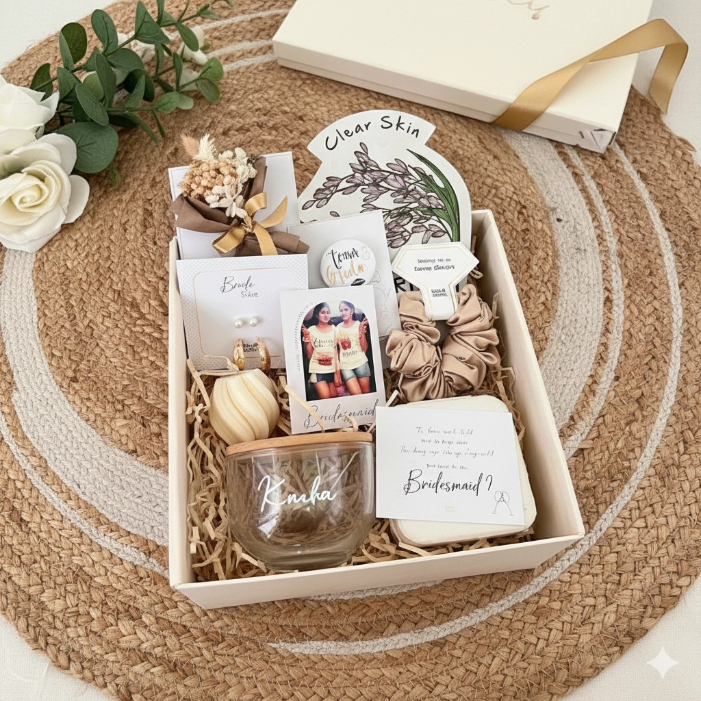Surprise your bride tribe with this beautifully curated Bridesmaid Hamper, designed to feel like a warm hug in a box. Each premium rigid box is personalised with her name and opens to reveal a soothing sheet mask, a customised clear coffee mug with spoon, a soft neutral scrunchie, and an elegant pair of earrings and studs. A chic mini bouquet, keepsake badge, scented candle, and personalised jewellery box add thoughtful layers of luxury. A proposal card completes the experience, making it perfect for asking “Will you be my bridesmaid?” or thanking them for being by your side. A timeless keepsake your girls will remember long after the wedding.