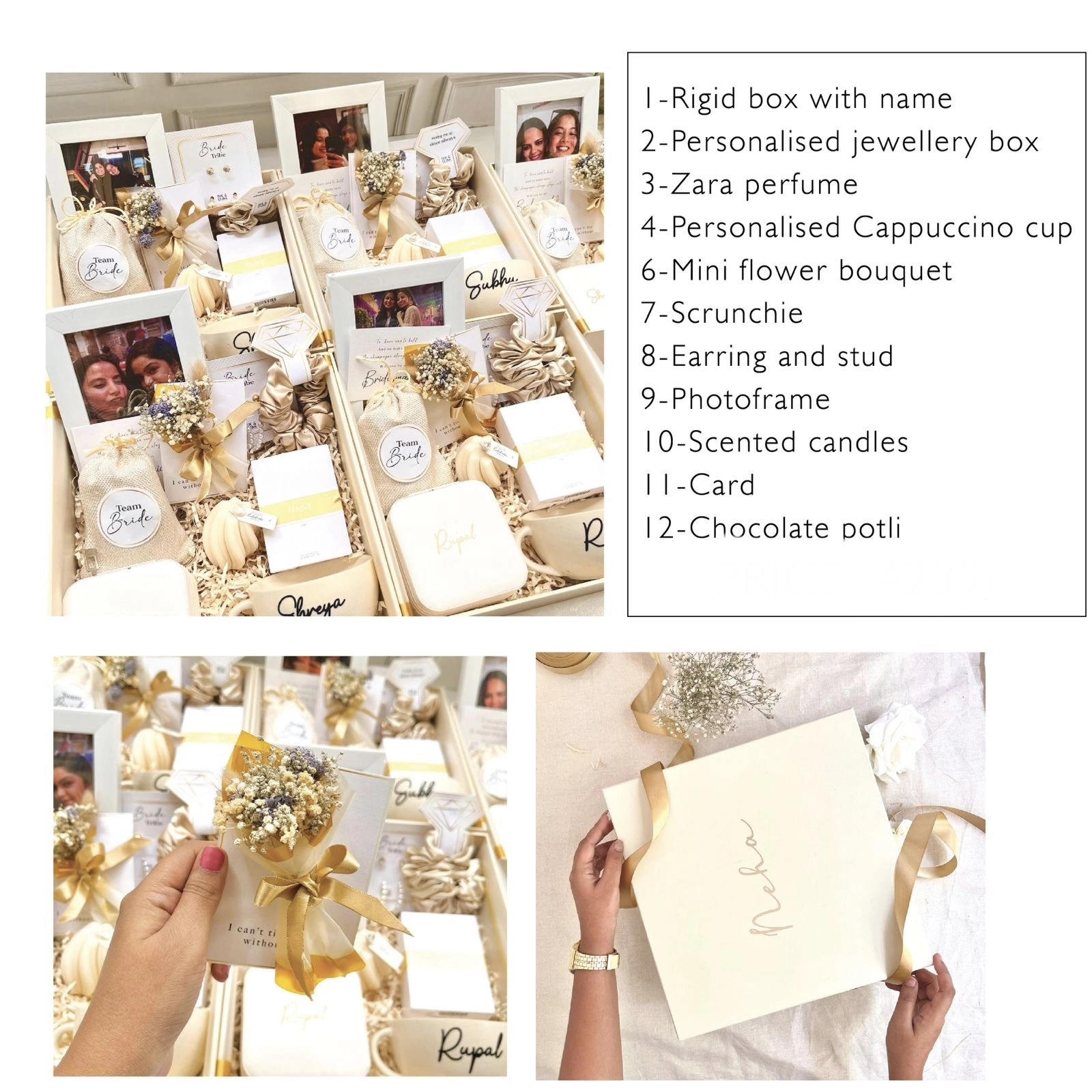 A luxe, all-in-one bridesmaid hamper featuring personalised box, jewellery case, cappuccino cup, photo frame, Zara perfume, flowers, candles and more in coordinated ivory-gold. Thoughtfully styled for a magical unboxing and a forever keepsake for your closest girls.