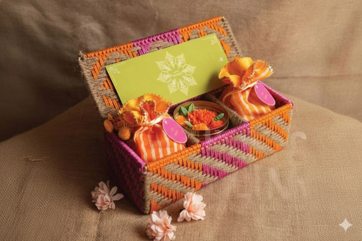 A vibrant woven organiser box hamper featuring two leheriya potlis with premium dry fruits, a marigold tin candle and a custom card. Beautifully reusable as a keepsake organiser, it’s a perfect festive or wedding gift that feels warm, personal and thoughtfully premium.