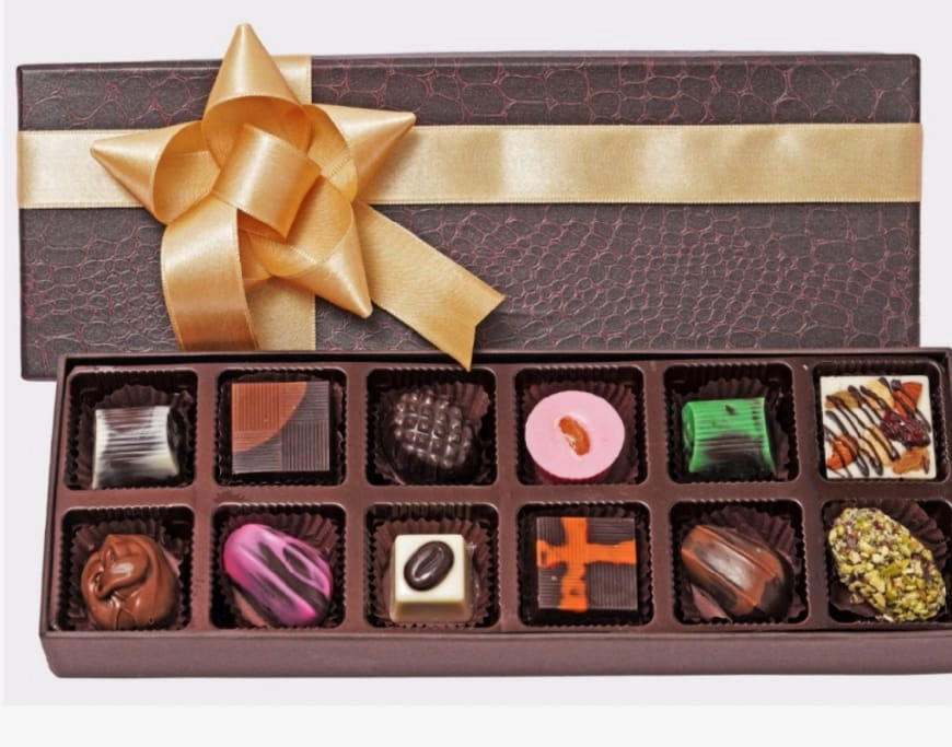 A stunning box of premium assorted chocolates, wrapped with a gold bow. Filled with handcrafted milk, dark, and white chocolates—perfect for wedding gifting or a luxurious treat for any celebration.