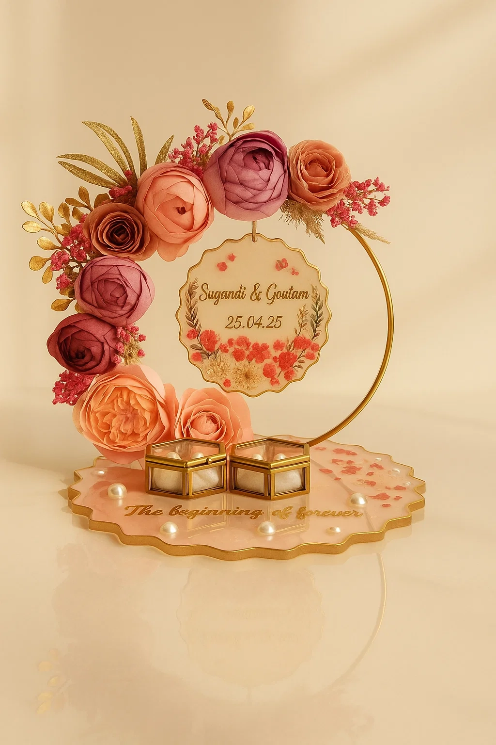 Mark your ring ceremony with this enchanting floral hoop engagement platter, designed to frame your “yes” moment beautifully. Set on a scalloped acrylic base printed with delicate florals and the words “The beginning of forever,” it features a sleek gold metal hoop adorned with handcrafted paper blooms in peach, pink, and mauve with golden foliage. Two hexagonal gold ring boxes sit at the center, surrounded by soft pearl accents for an elegant, luxurious look. The hanging acrylic disc is fully personalized with your names and engagement date, transforming the platter into a bespoke keepsake you’ll cherish long after the celebrations. Perfect for engagement, roka, or ring ceremony photos.