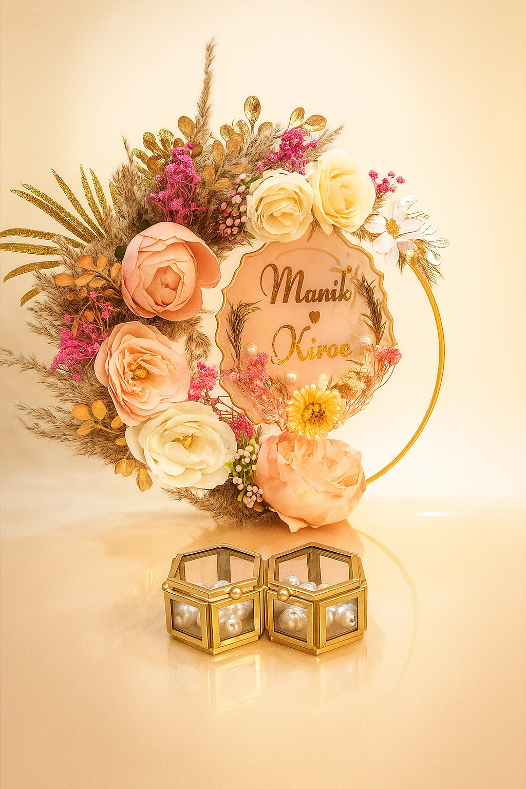 Celebrate your ring ceremony with this elegant blush engagement platter, crafted on a golden hoop base and adorned with luxe faux florals in peach, cream, and soft pink. A central acrylic disc showcases your names in a beautiful gold script, framed by delicate florals, dried foliage, and pearl accents. Two matching hexagonal gold ring boxes with pearl details add a regal finishing touch, making every ring-exchange photo look stunning. Perfect for engagements, roka, or anniversary celebrations, this platter doubles as a keepsake that can be displayed in your home long after the ceremony. Custom name detailing makes it uniquely yours and unforgettable for guests.