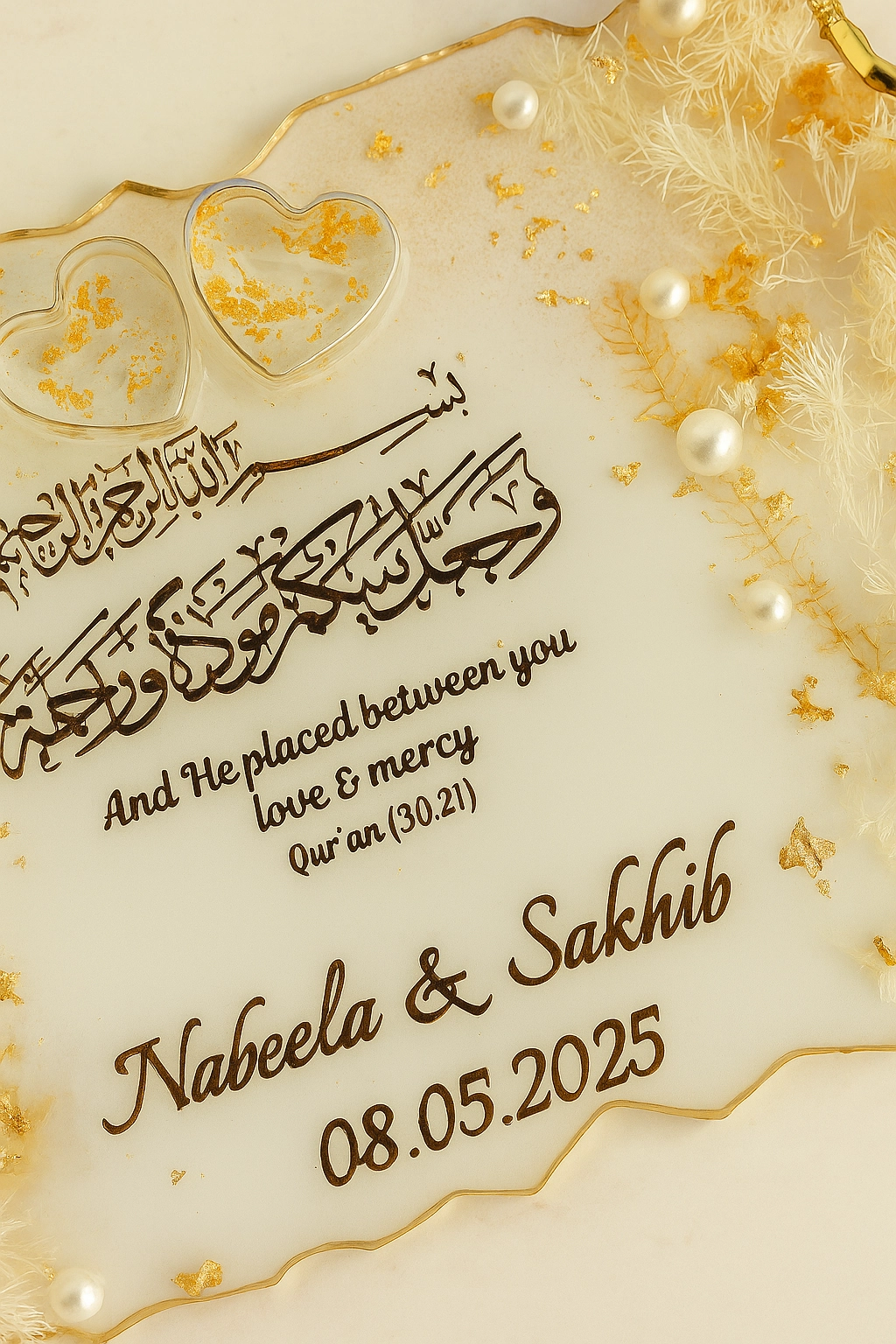 Celebrate your engagement with this exquisitely handcrafted platter featuring a beautiful Quran verse, “And He placed between you love & mercy (Qur’an 30:21),” elegantly inscribed in Arabic and English. The rectangular resin base is adorned with preserved florals, scattered gold foil, and pearl accents along the edges for a radiant, luxurious finish. Twin heart-shaped ring holders sit gracefully on top, ready to present your rings in style. Names and date are fully customizable, making it a meaningful keepsake long after the ceremony. Perfect for nikkah, engagement, or ring ceremony stages, this platter adds a spiritual, romantic touch to your special moment.