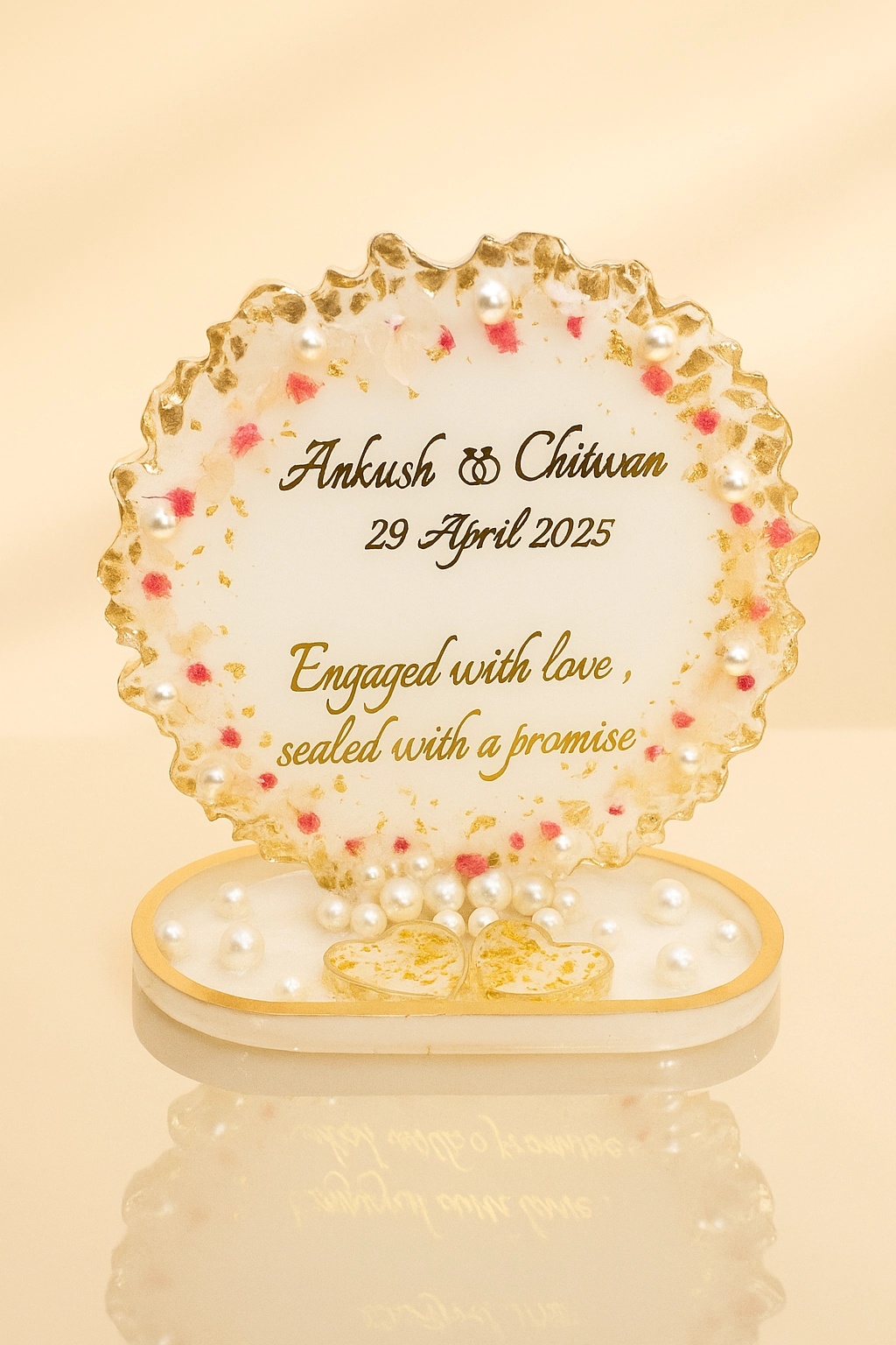 Celebrate your ring ceremony with this elegant personalised engagement platter, crafted in glossy resin with a scalloped circular backdrop and matching oval base. Delicate gold foil, soft pink accents and scattered pearls frame your names, date and a heartfelt message in luxurious gold typography. The cushioned oval base is accented with twin heart details and lustrous pearls to beautifully cradle both rings. Perfect for rituals, close‑up photography and as a timeless keepsake, this platter can be customised with your names, event date and wording to reflect your love story and wedding décor. A sophisticated centrepiece for your special day, and a cherished memory for years to come.