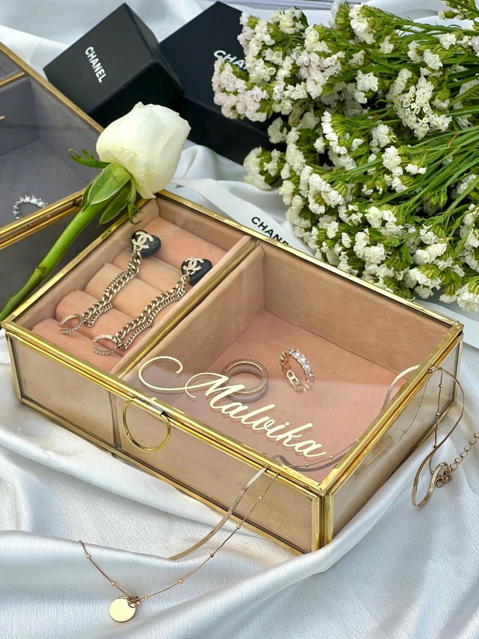 A heartfelt, personalized glass jewellery box that captures bridal love—gold-framed, velvet-lined, and custom-engraved for your bridesmaids. Timeless elegance meets everyday luxury.