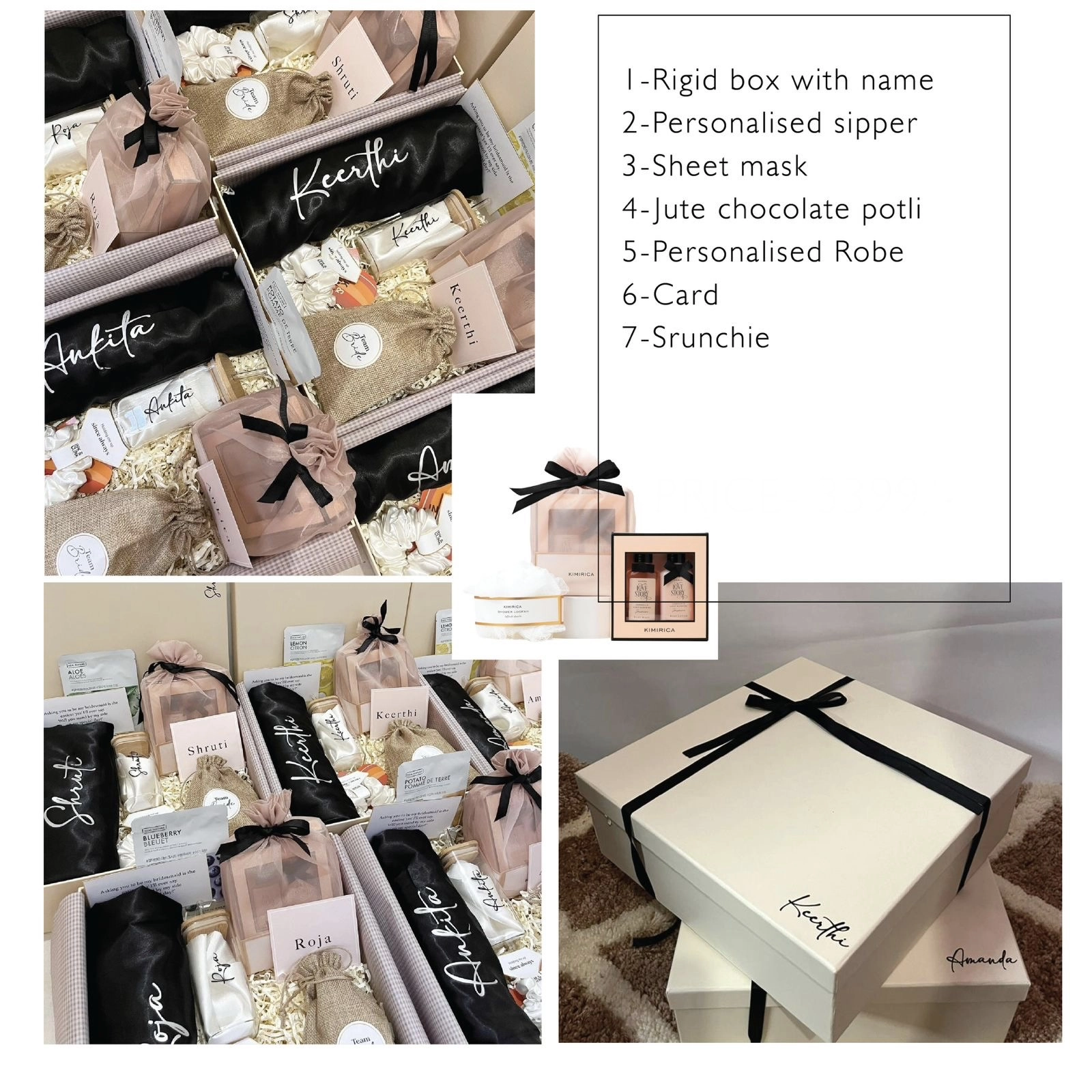 Celebrate your bride tribe with this beautifully curated personalised bridesmaid hamper. Each rigid keepsake box, finished with a chic black ribbon and custom name, opens to reveal a coordinated set of pampering essentials: a personalised sipper, hydrating sheet mask, jute chocolate potli, and a luxurious satin personalised robe. A premium card with your bridesmaid’s name and a soft scrunchie complete the experience, all nestled in shredded filler for an elegant unboxing moment. Perfect for proposals, wedding morning photos, or thank-you gifts, this hamper blends style, utility, and heartfelt customization your girls will cherish long after the celebrations.