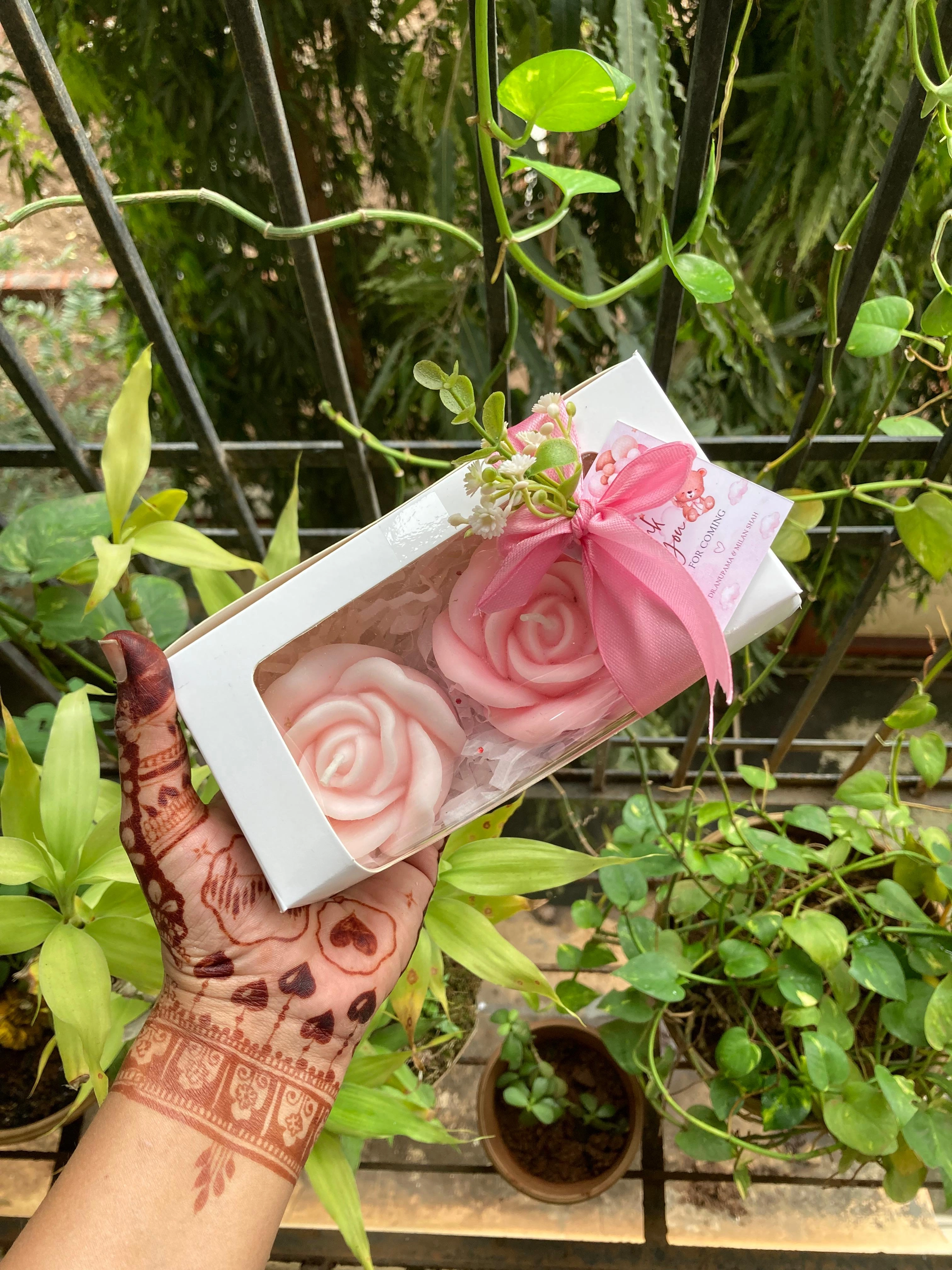 Delicate rose-shaped scented candles presented in a ribbon-tied gift box — charming wedding return gifts that smell divine and double as keepsakes.
