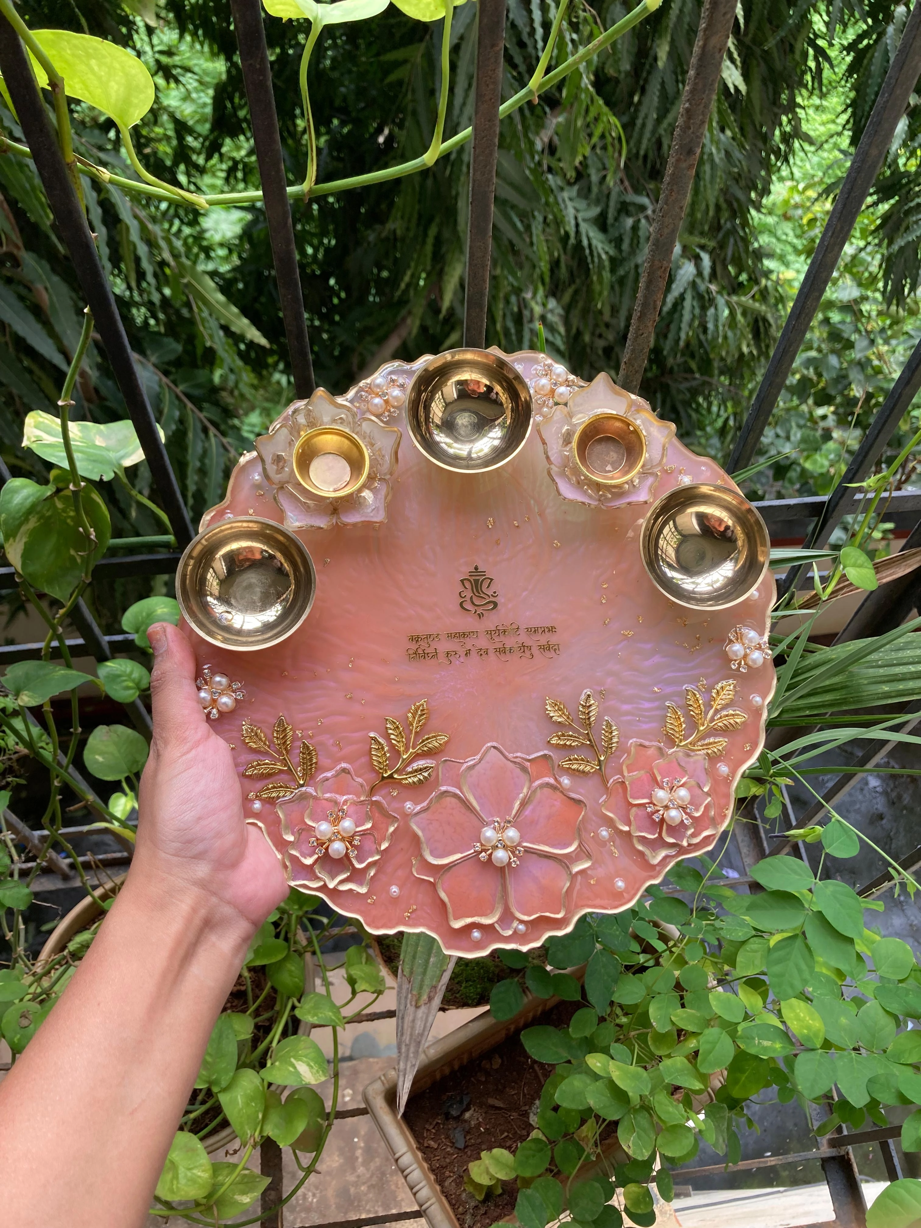 A handcrafted 10" blush-pink resin pooja thali with gold floral detailing, four brass bowls and central diya — lightweight, gift-ready, and perfect for intimate wedding rituals.