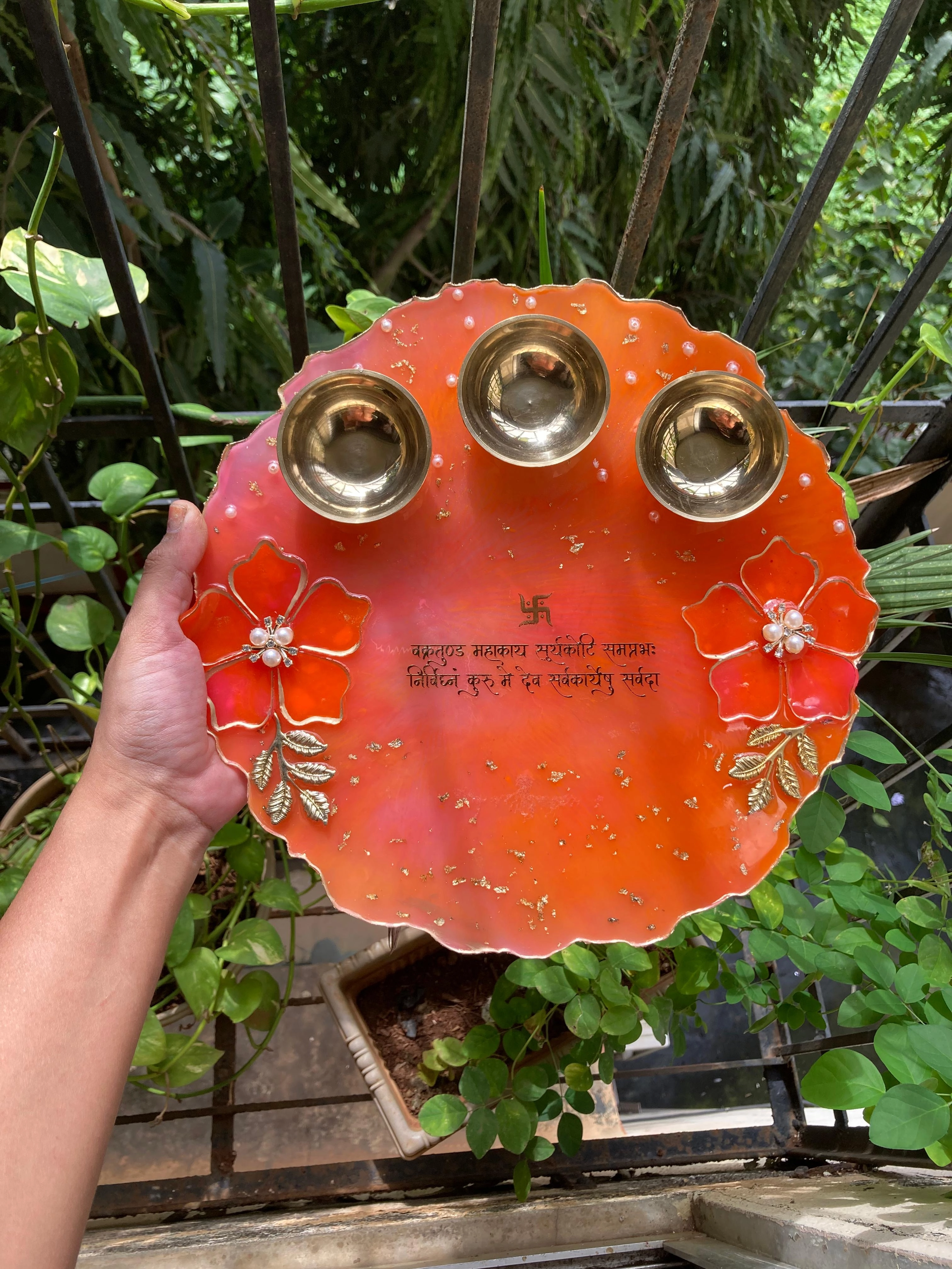 A vibrant, handcrafted orange pooja thali designed for auspicious ceremonies and gifting. The scalloped-edge thali features metallic diya cups, delicate floral embellishments with bead accents, and a printed shloka/auspicious message at the center — making it both decorative and devotional. Finished with subtle gold speckles and raised detailing, this thali is ready to use for aarti, tilak, and small offerings, and makes a memorable return-gift or puja essential for weddings and festivals.