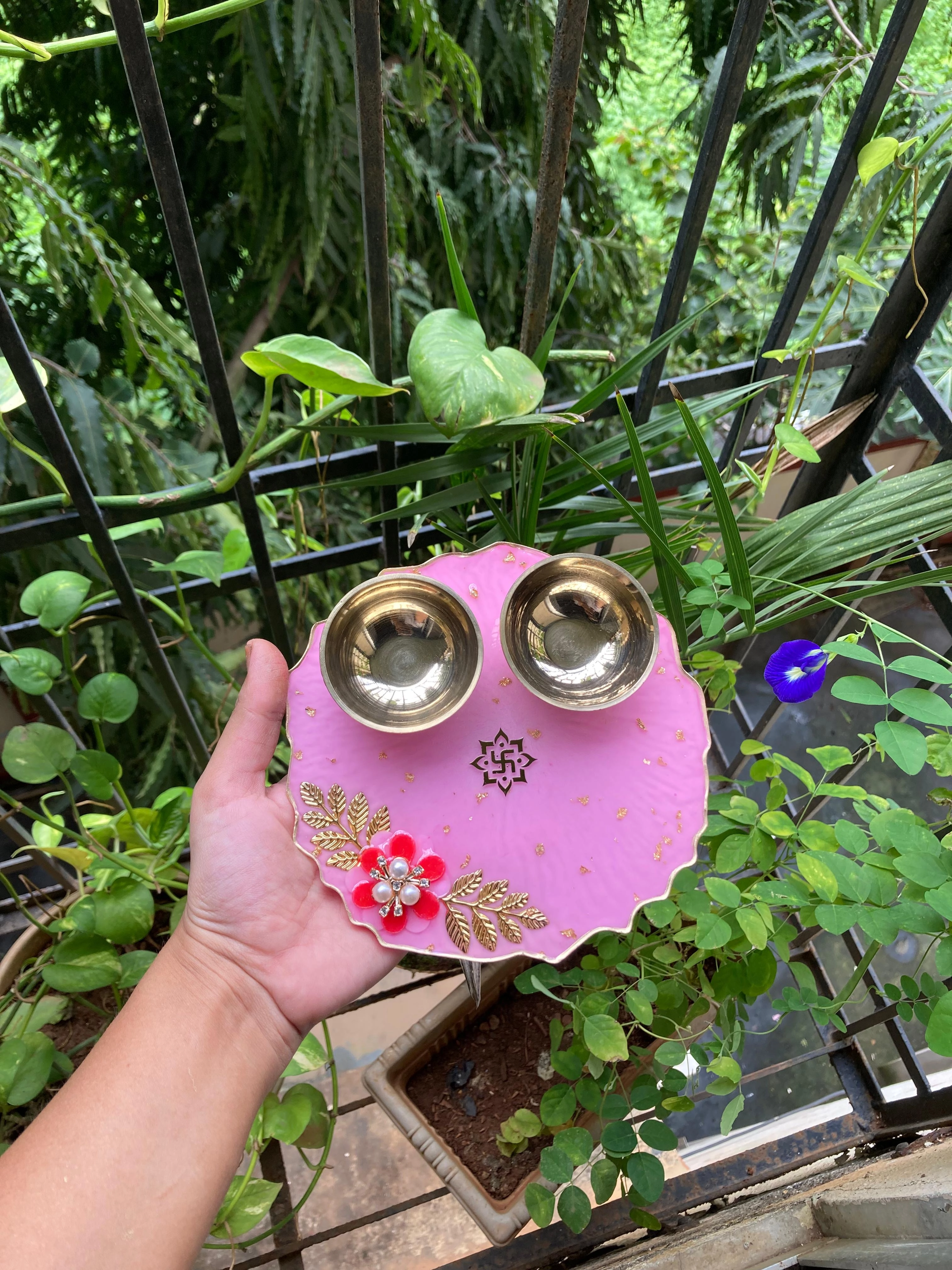 Handcrafted 6" pink pooja thali with two brass bowls and floral-gold detailing—perfect for wedding rituals, gift hampers, and keeping traditions beautiful.