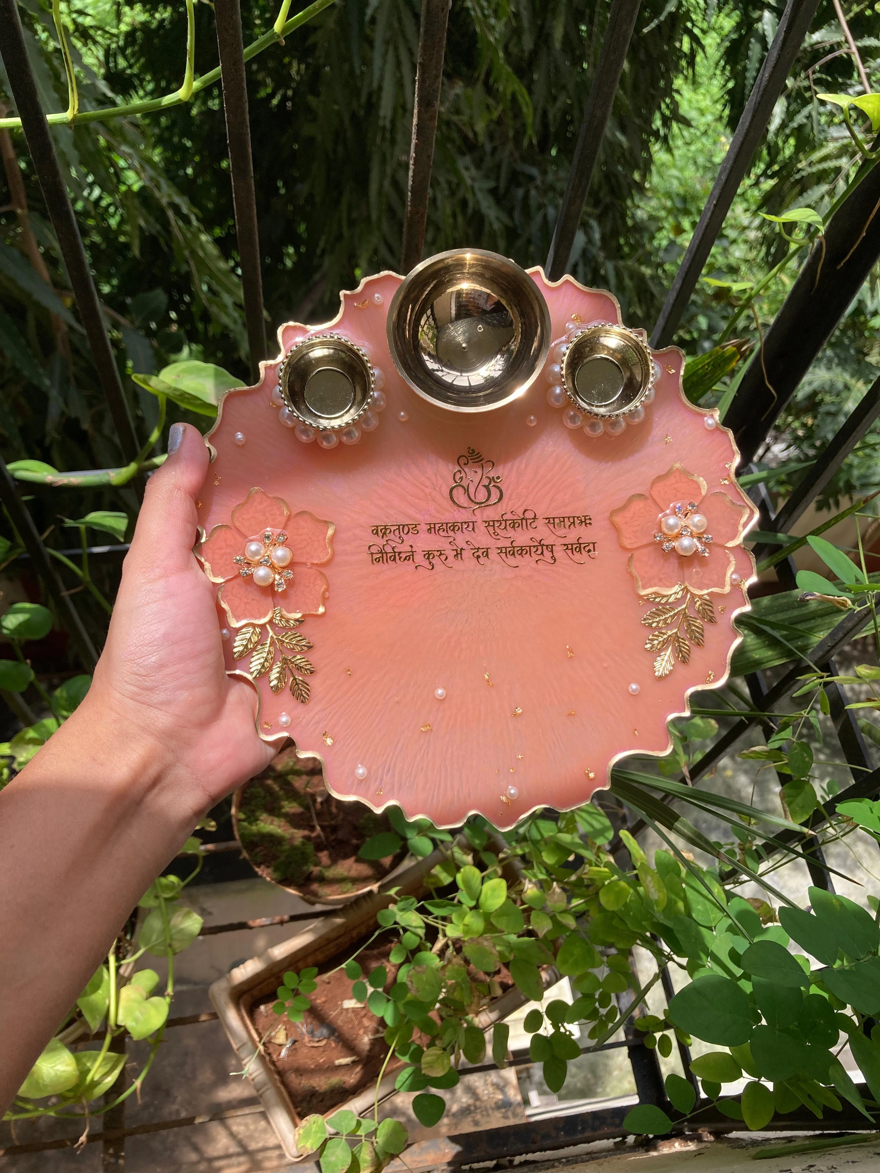 Soft-blush 8" pooja thali with gold diya holders and floral accents — a lightweight, gift-ready ritual plate that adds charm to wedding ceremonies and daily puja.