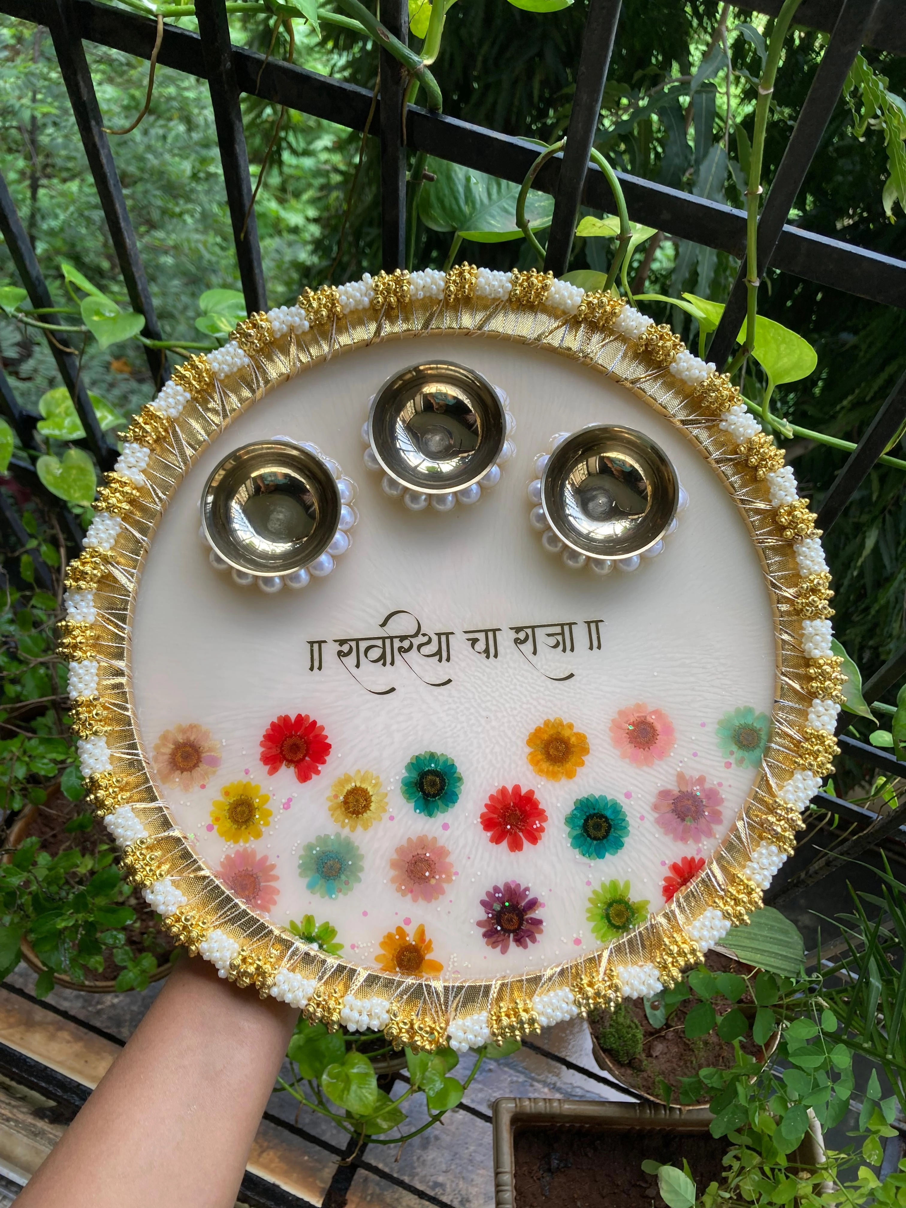This 12-inch Pooja Thali is a handcrafted ceremonial plate designed for meaningful rituals and gifting. It features three brass diya bowls, a soft ivory base with floral artwork, and a gold-tassel fringe around the rim; the centre can be personalized with custom text in Devanagari or English as shown. Lightweight yet sturdy, the thali blends traditional materials and modern finishing to create a keepsake your guests will cherish — ideal for Karva Chauth, housewarmings, wedding ceremonies, and festive return gifts.