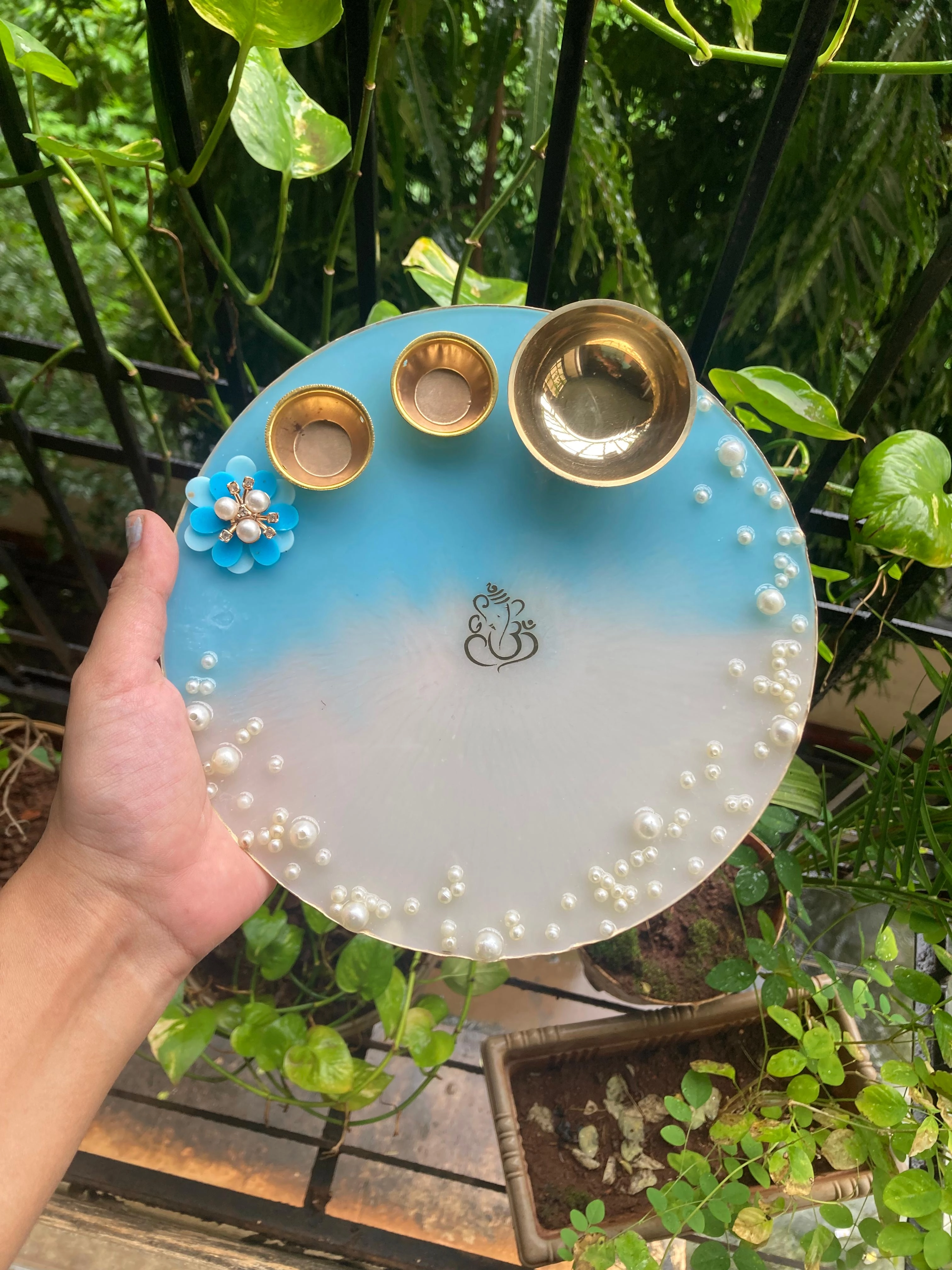 This 8-inch ombré resin pooja thali blends contemporary design with traditional ritual utility. Hand-poured in a soft blue-to-white gradient, the thali is finished with pearl embellishments, a delicate floral accent, and an engraved Ganesh motif — perfect for a wedding aarti or home shrine. The set includes three small brass kumkum/dhavani bowls and one larger diya/roli bowl securely embedded into the resin. Lightweight, water-resistant, and easy to wipe clean, it doubles as a keepsake that elevates ceremonial moments.
