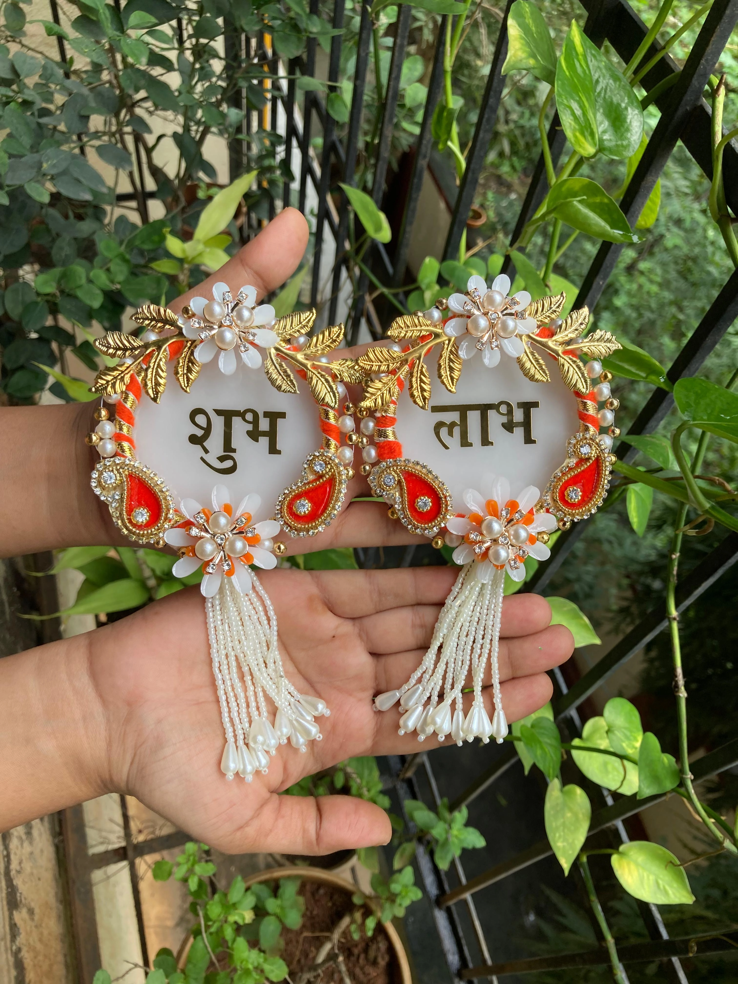 Handcrafted Shubh & Labh door hangings with gold-leaf motifs, pearl florals and tassels — an elegant, auspicious pair to welcome prosperity at weddings and festivals.