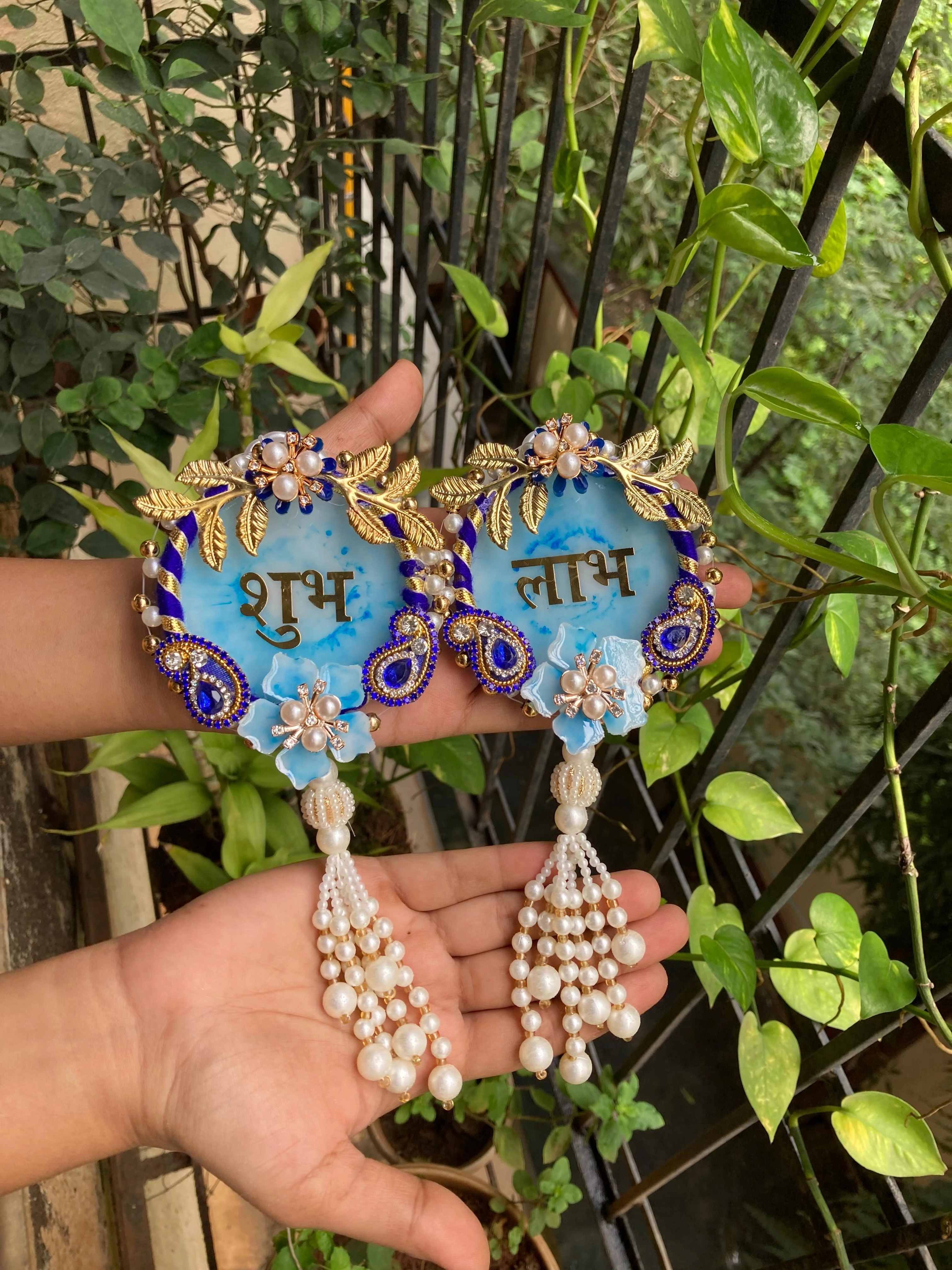 Bring traditional blessings and bridal charm to your wedding home with this Luxe Shubh Labh pair. Handcrafted with satin-backed medallions, mirror and crystal embellishments, gold-leafed filigree and pearl tassels, each piece features the auspicious words ‘शुभ’ and ‘लाभ’ in elegant Devanagari script. Perfect for mandap entrances, gift boxes, or as ceremonial decor, these keepsakes combine festive symbolism with couture detailing — lightweight, ready-to-hang, and ideal as return gifts or styling accents for rituals.