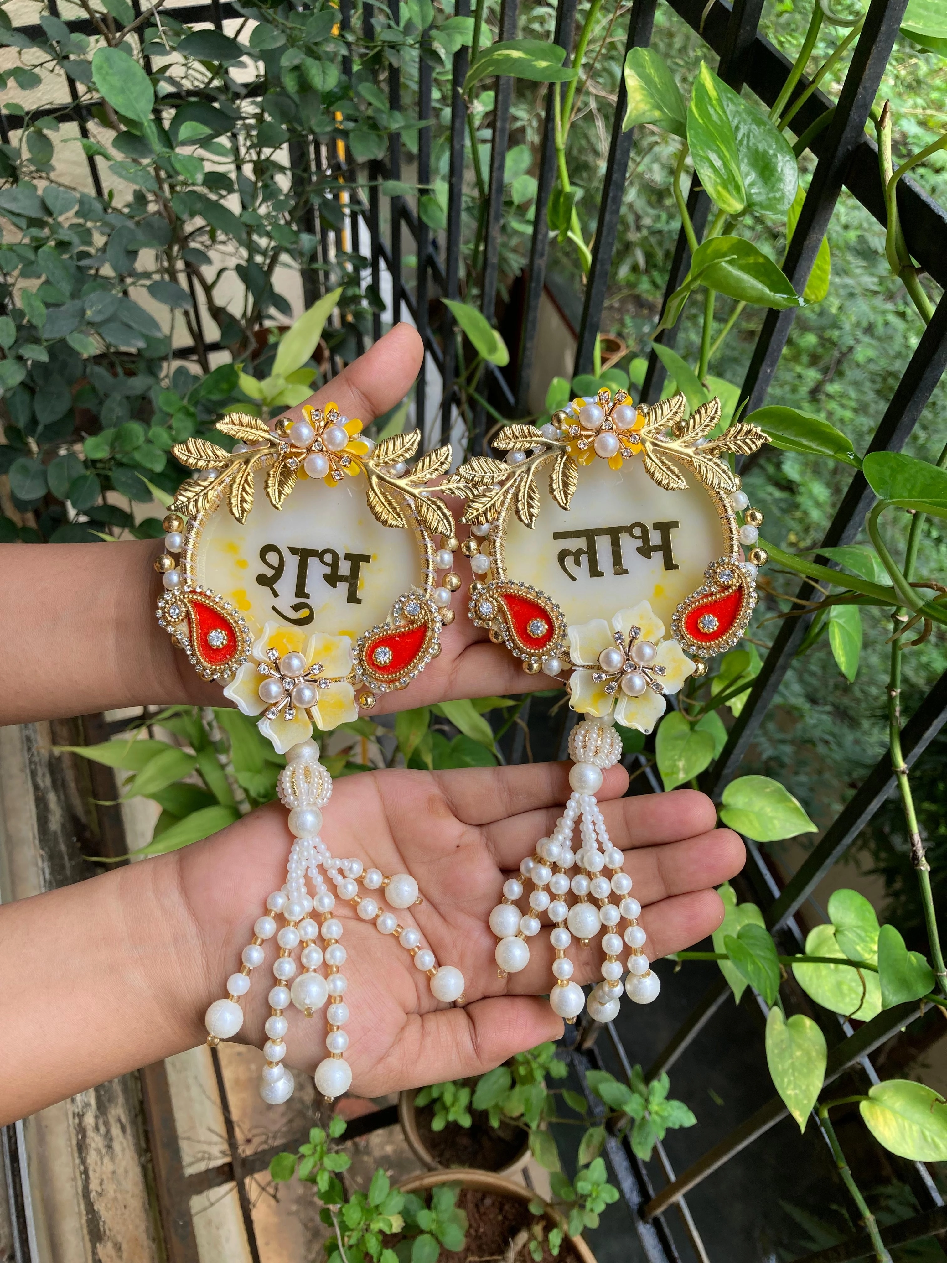 Bring auspicious charm to your doorway — a gold-accented Shubh & Labh pair with floral motifs and pearl tassels, handcrafted for elegant entrances and wedding ceremonies.