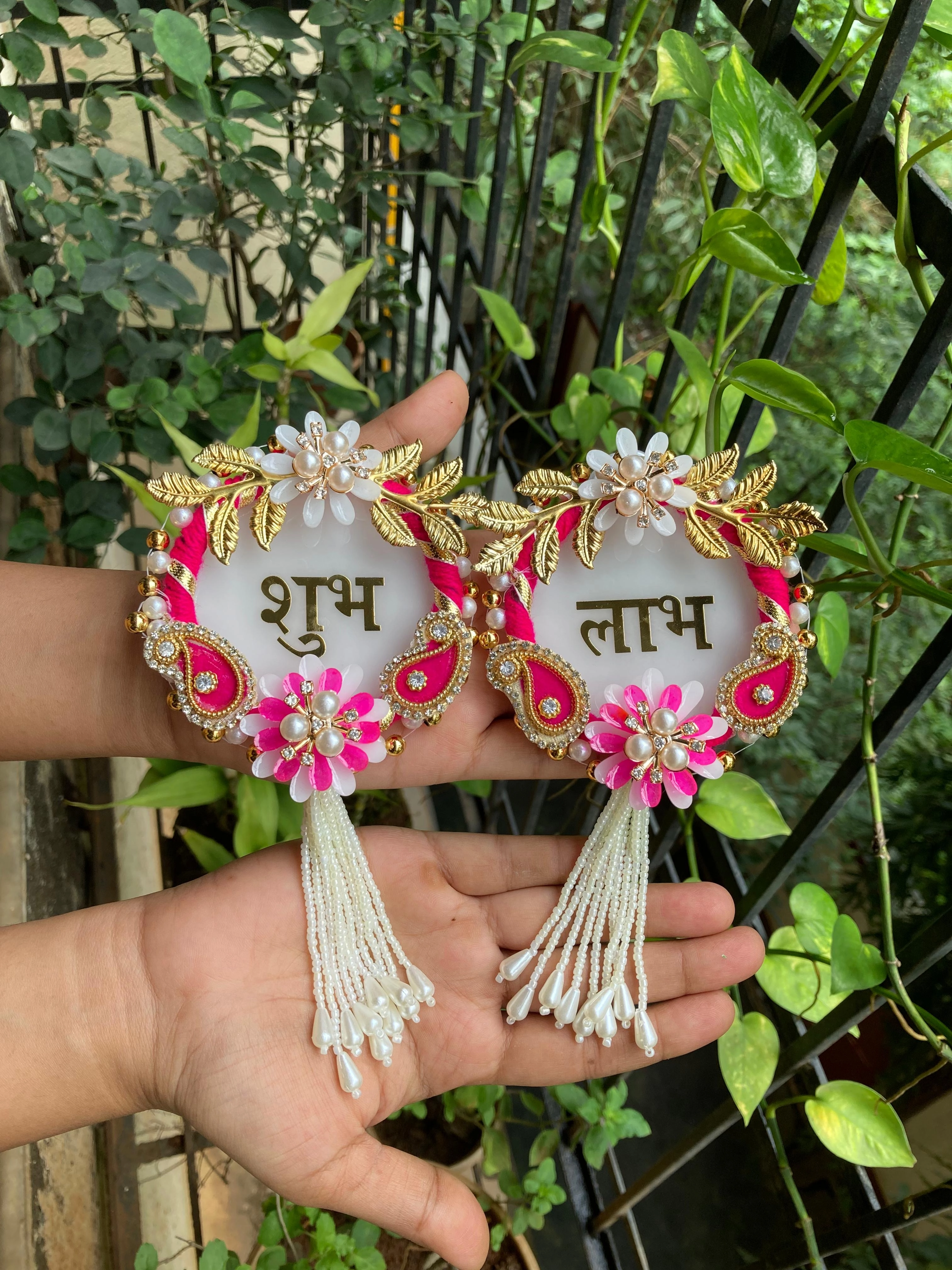 A chic, auspicious pair crafted to uplift your wedding entrances and puja corners. Each round plaque features hand-applied gold-leaf motifs, silk-petal floral accents, and a pearl-beaded tassel; one reads “शुभ” and the other “लाभ” in elegant Devanagari script. Finished on a soft ivory base with vibrant pink highlights and glittering crystal centers, these lightweight hangings are ready-to-use and make memorable return gifts or decor pieces that blend tradition with modern style.