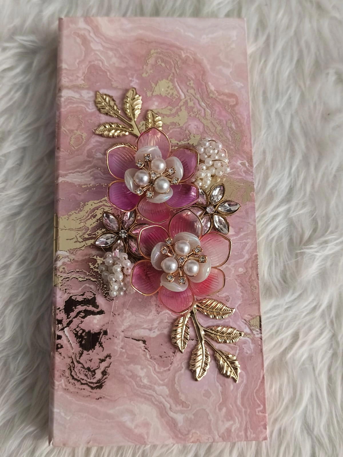 Give blessings in style with this blush marbled money box, adorned with pearl flowers and gold leaves—a keepsake that adds luxury and meaning to every wedding celebration.