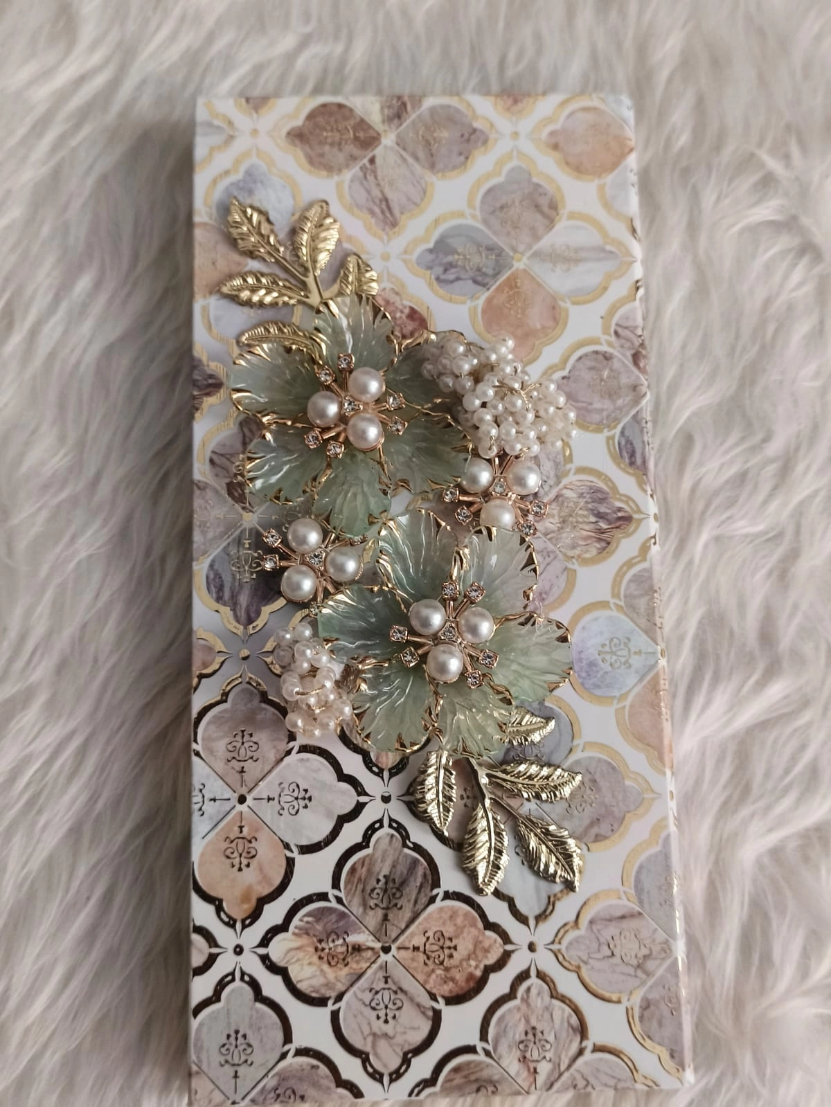 Gift graciously with this elegant floral money box, featuring gold leaves, pearls, and delicate florals – perfect for wedding shagun presentations and treasured keepsakes.