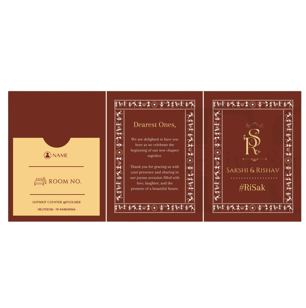 Rich maroon and gold two fold itinerary card with monogram cover, welcome note, and detailed day‑wise function schedule. Features a smart pocket for guest name and room details. Fully customizable to your events, colours, and branding – a stylish guide your guests will keep close.
